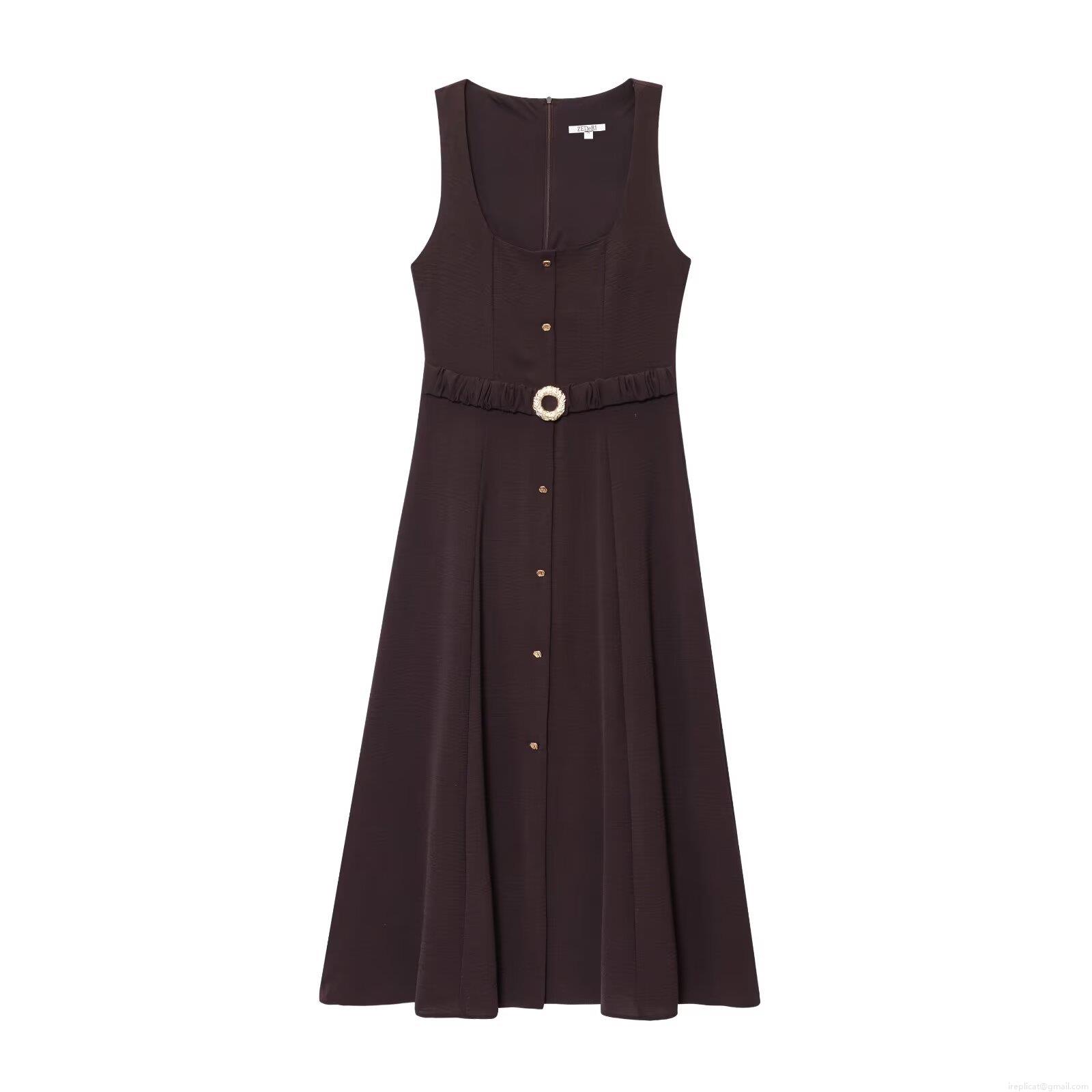 Elegant Square Neck Sleeveless Midi Dress Polyester Ice Silk Wrinkle Texture Solid Color One-Piece Dress With Belt Gold Buckle Button Detail For Women Streetwear Fashion Dating Party Office Lady Back Zipper Slim Fit