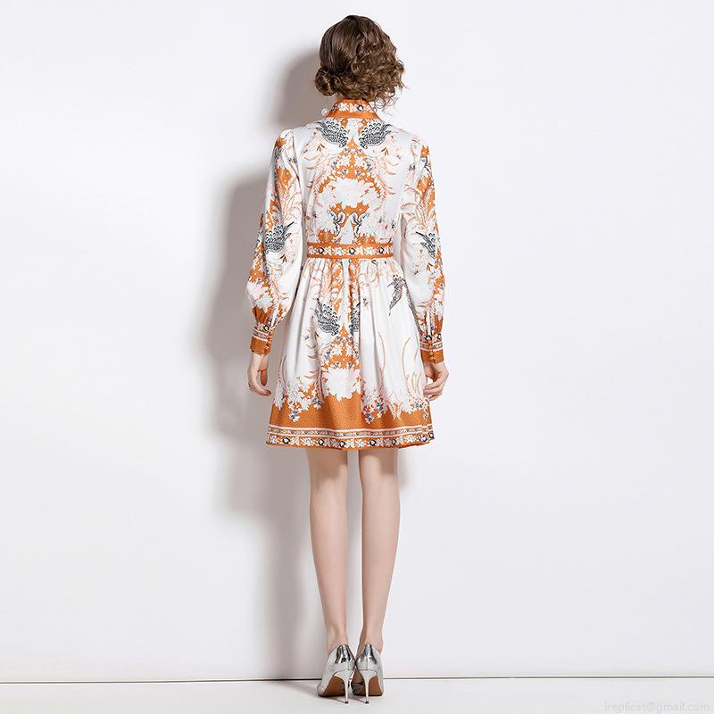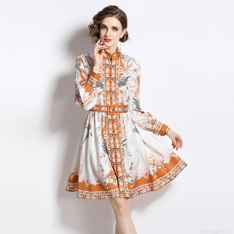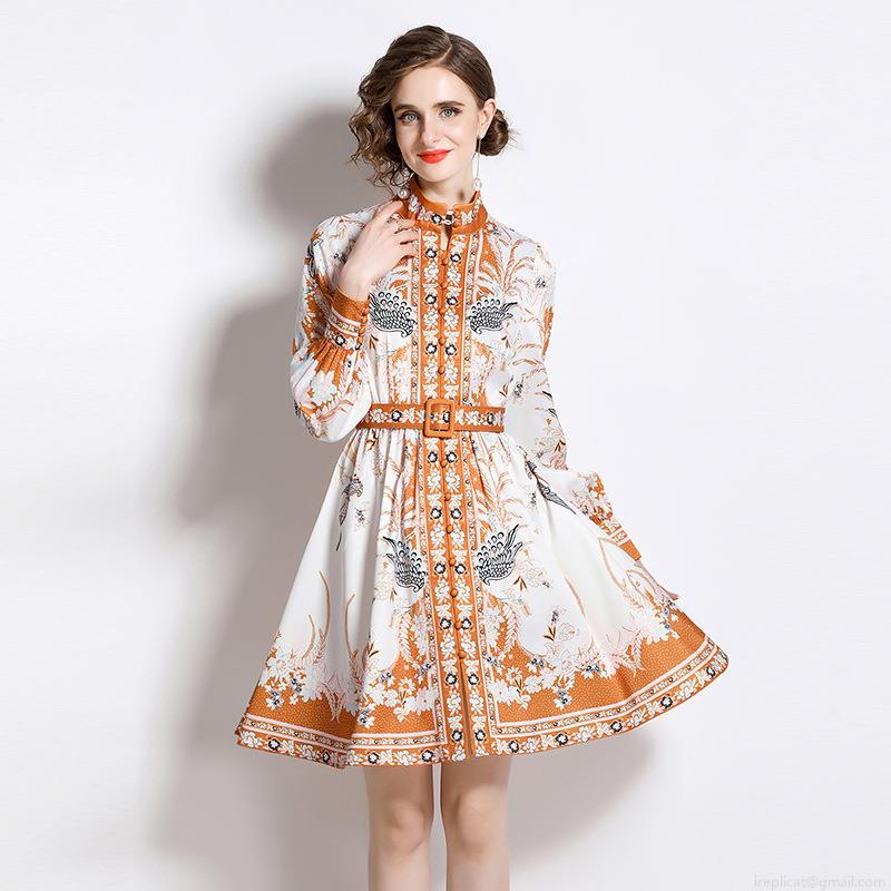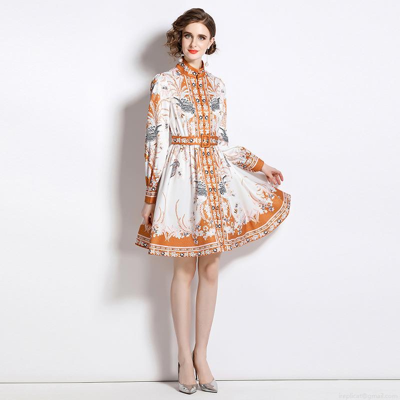 Plants And Flowers, Stand-up Collar, Single-breasted, Lantern Sleeves, Baroque Scrollwork, With Belt, Positioning Printing, Phoenix Totem