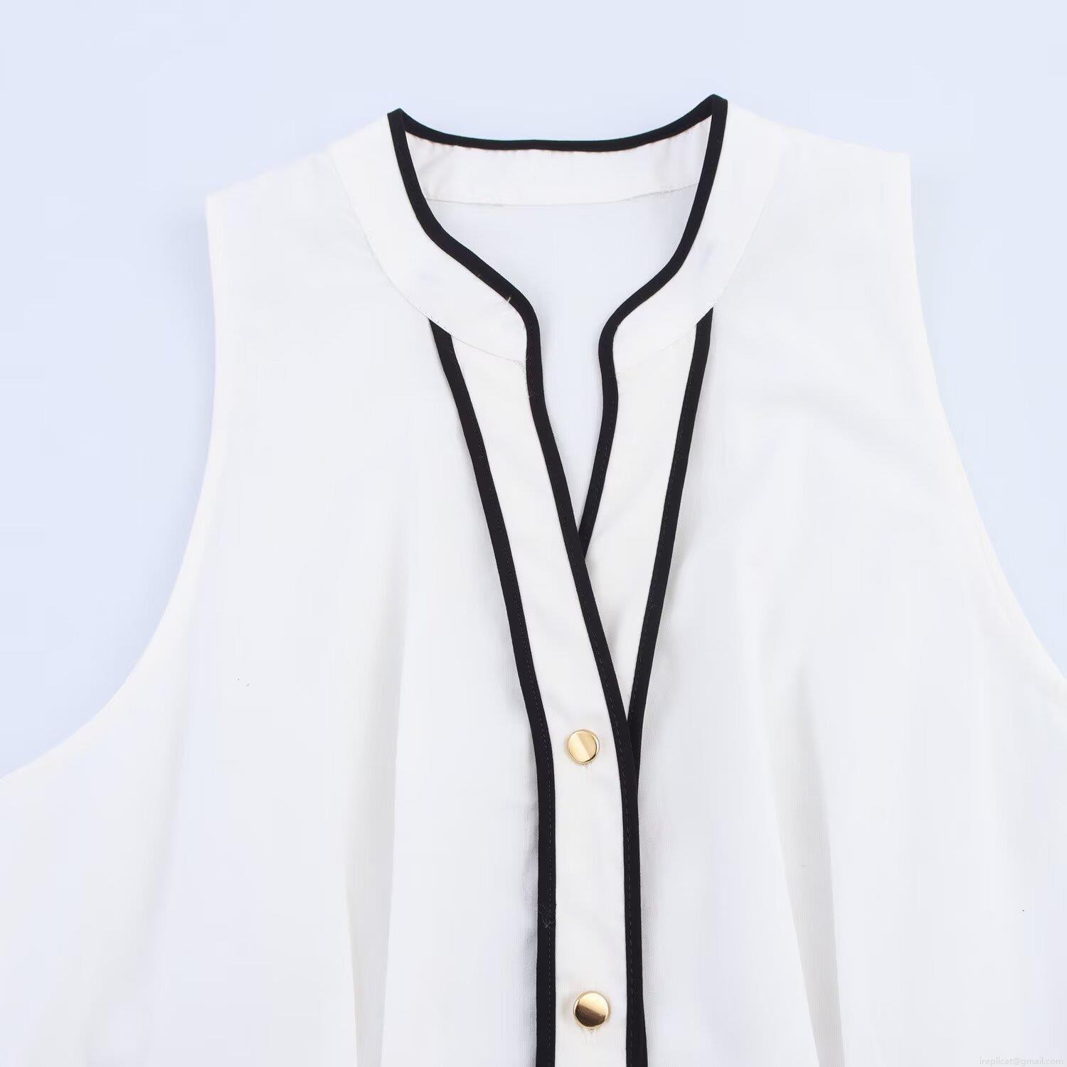 • Elegant White Sleeveless Midi Dress With Black Contrast Trim And Belt Classic Lapel V-Neck Single-Breasted Poplin A-Line Dress For Women Socialite Office Casual Style