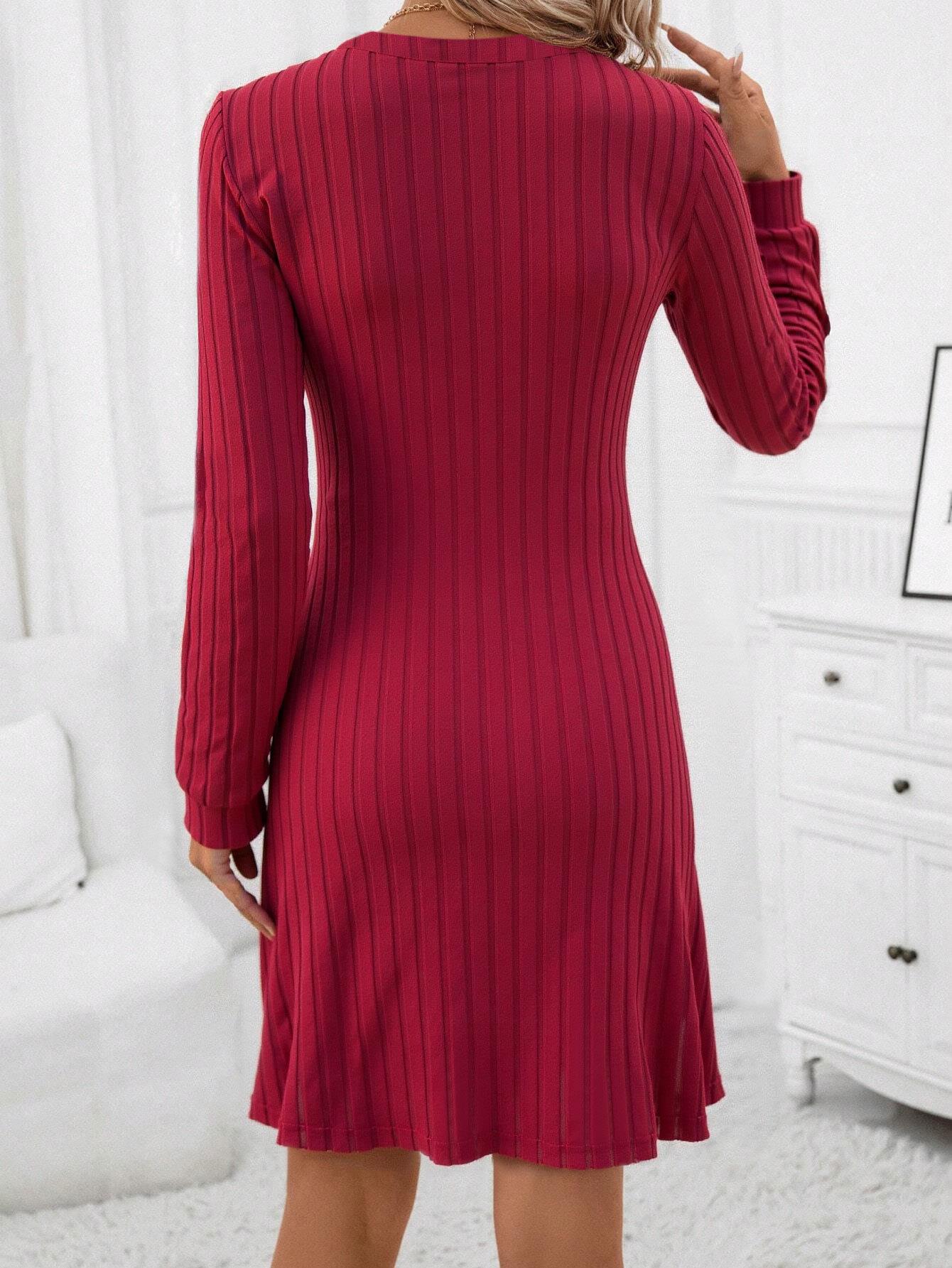 • Elegant Wine Red V Neck Long Sleeve Ribbed Knit Midi Dress Slim Fit Solid Color Casual Commute Bodycon Sweater Dress For Women