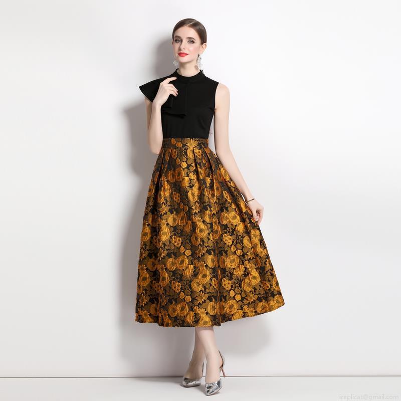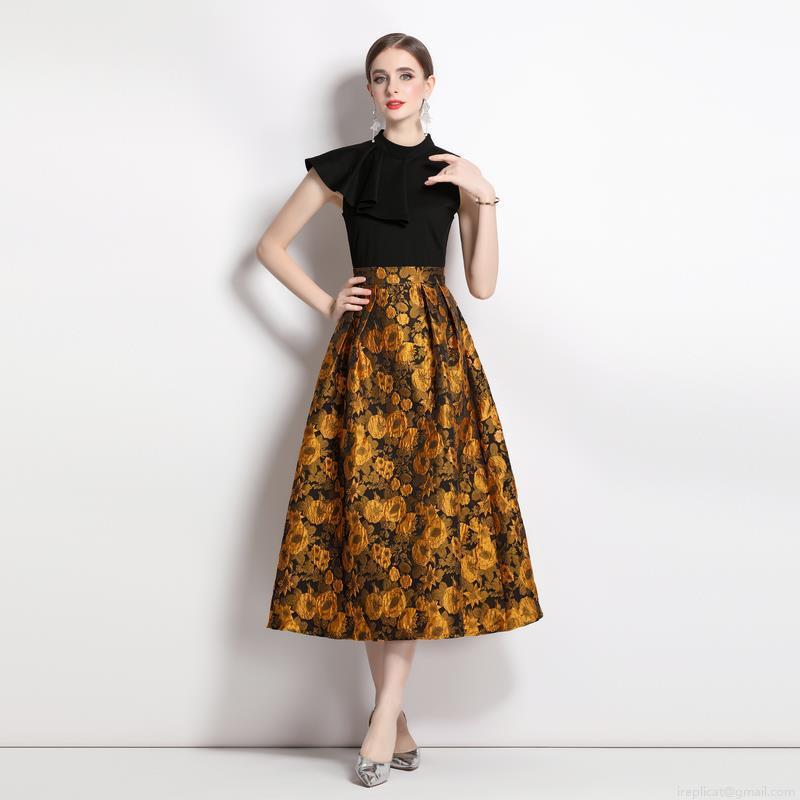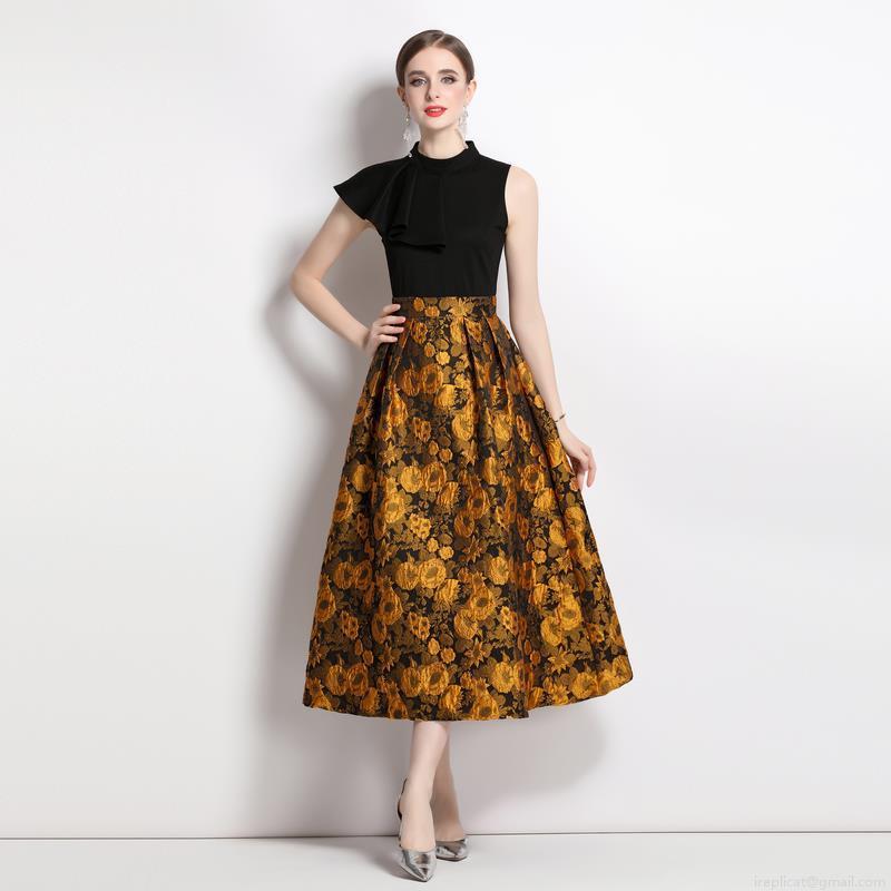 Flowers, Splicing Design, Stand-up Collar Design, Ruffle Decoration, High-waisted Wide Skirt, Large Abundant Flowers, Heavy Industry Jacquard