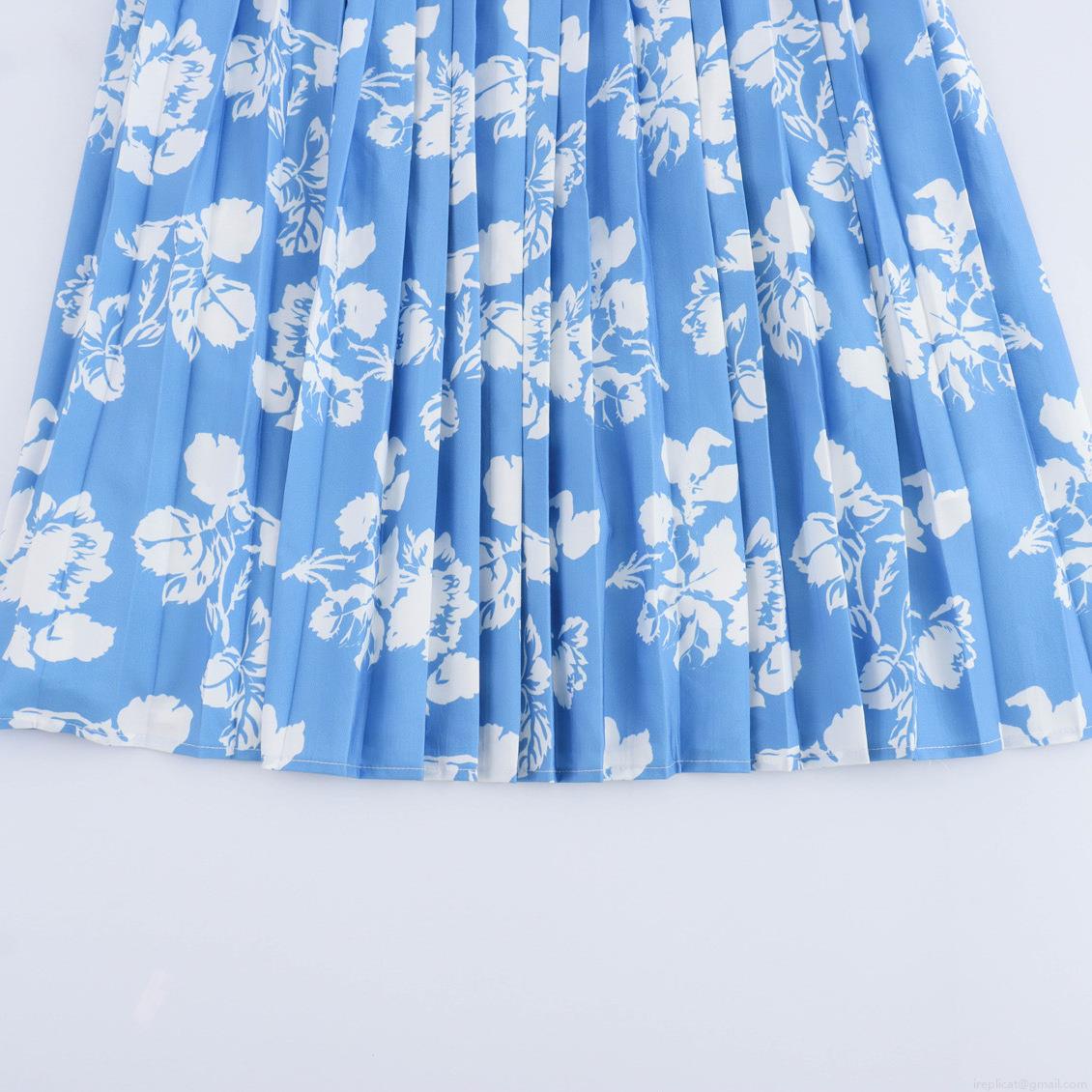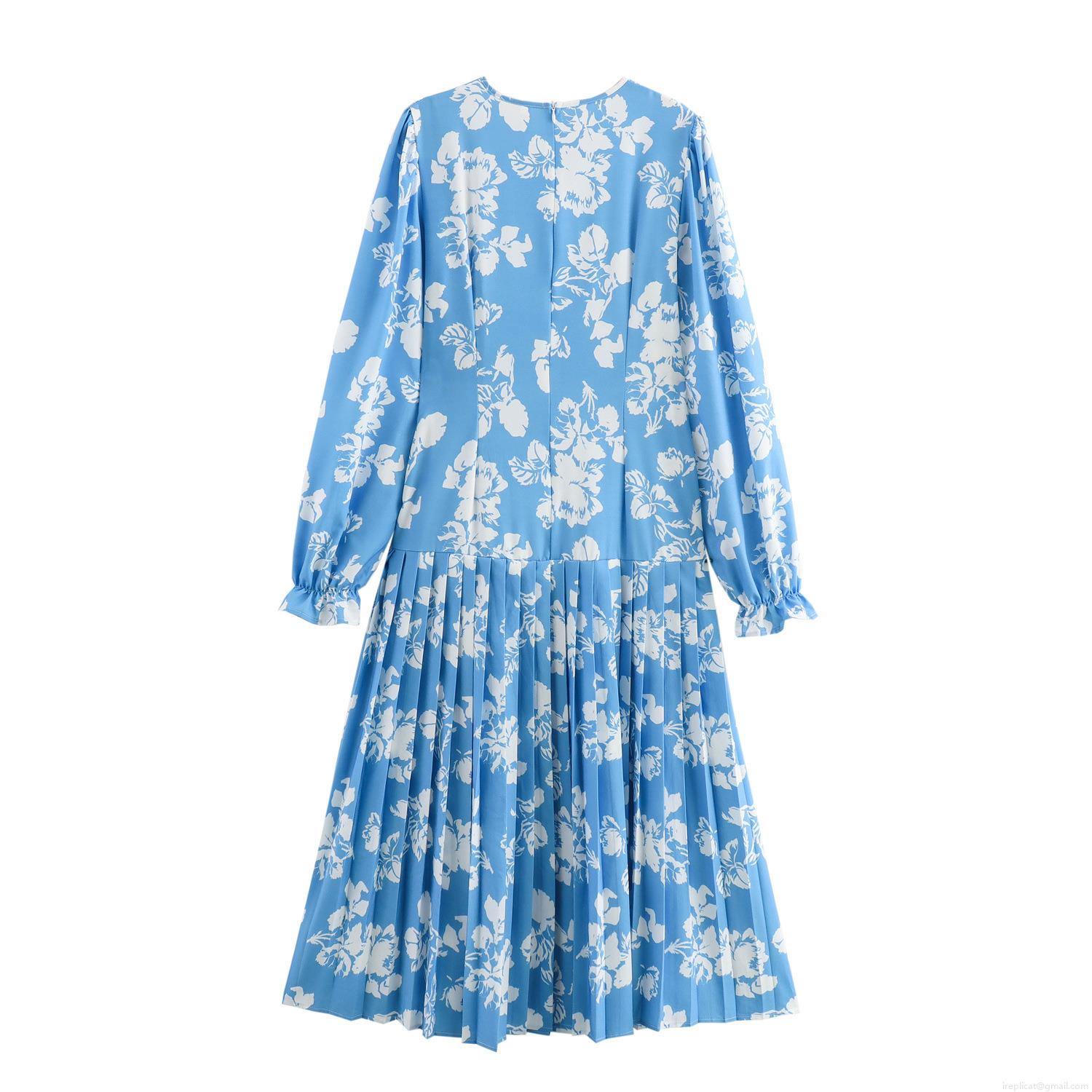 • Elegant Women Light Blue Floral Pleated Long Dress Long Sleeve Round Neck Asymmetric Gold Buttons High Waist Autumn Midi Maxi Dress
