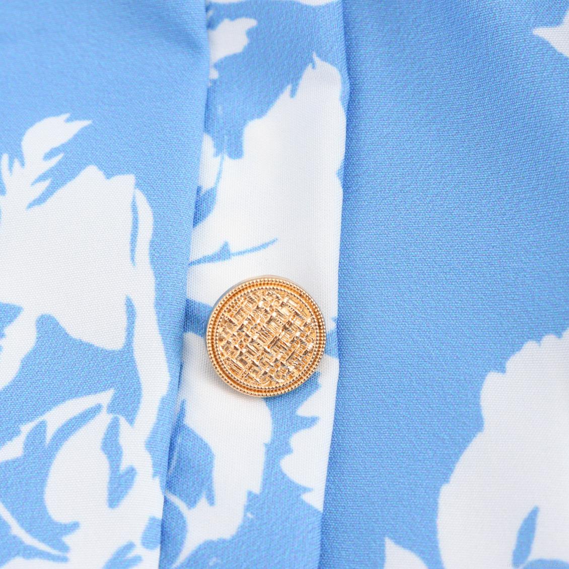 Elegant Women Light Blue Floral Pleated Long Dress Long Sleeve Round Neck Asymmetric Gold Buttons High Waist Autumn Midi Maxi Dress