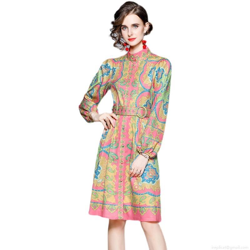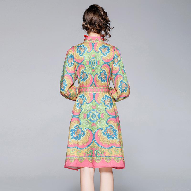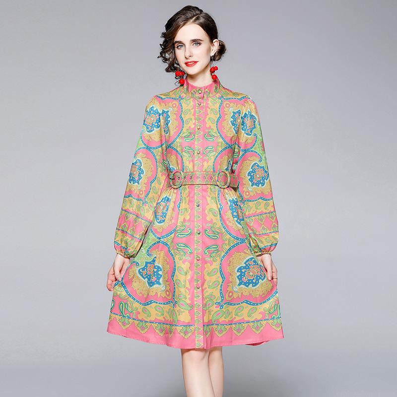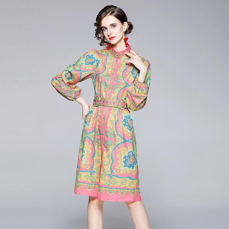 • Elegant Women Retro Paisley Print A-Line Dress Stand Collar Long Lantern Sleeve With Belt Bohemian Party Office Midi Dresses Polyester