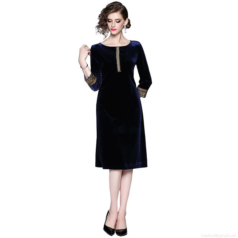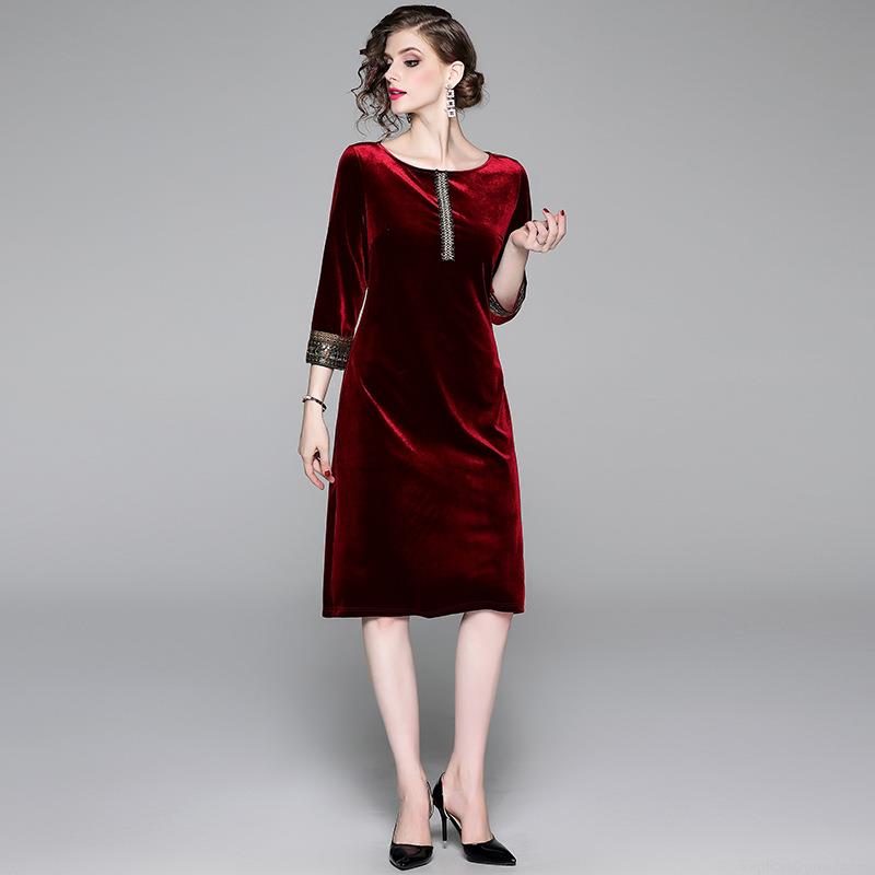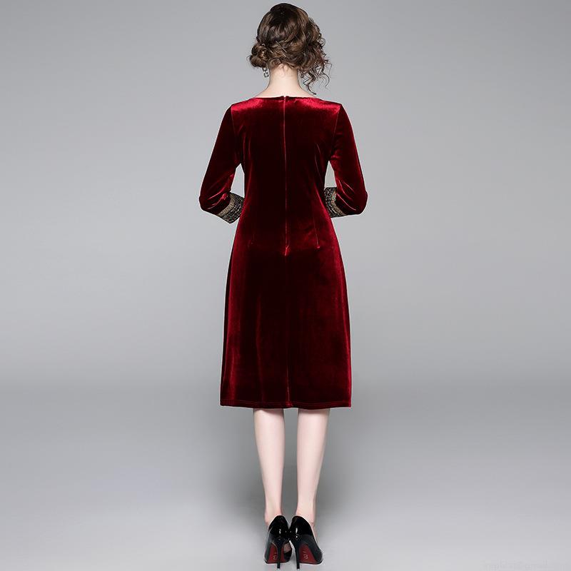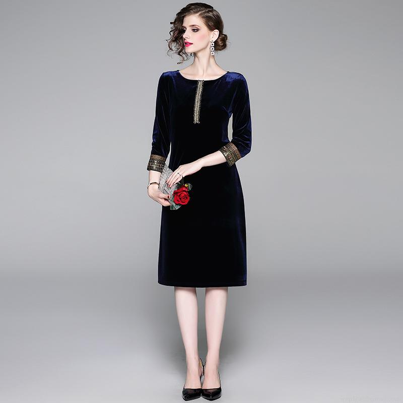 • Elegant Women Retro Velvet Midi Dress With Embroidery Sequin Beading Cuffs Slim Fit 3/4 Sleeve Crew Neck Party Evening Cocktail Dress