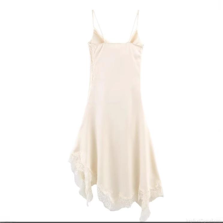 • Elegant Women Satin Lace Trim Sling Dress Deep V Neck Sleeveless Asymmetric Hem Midi Cami Dress For Party Clubwear