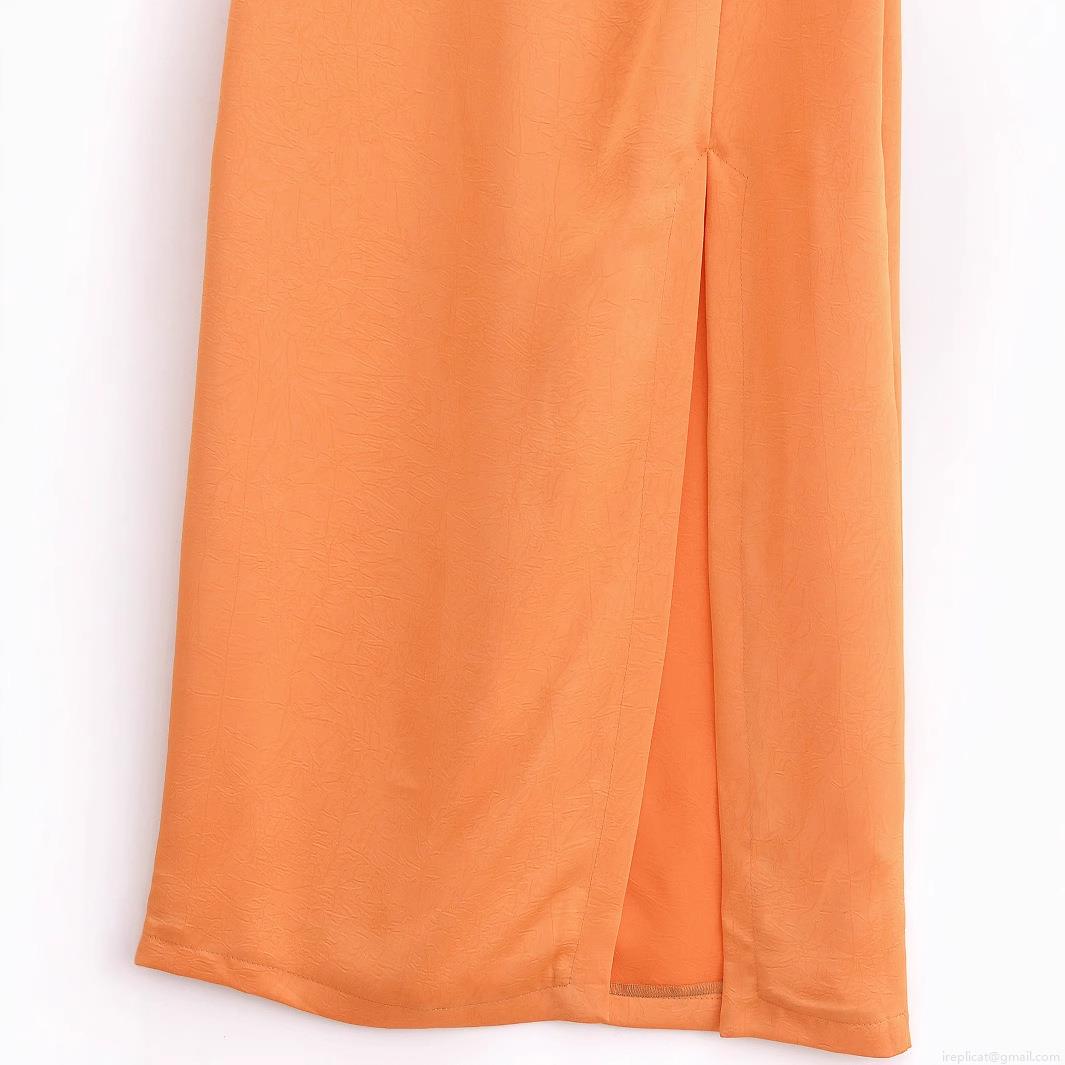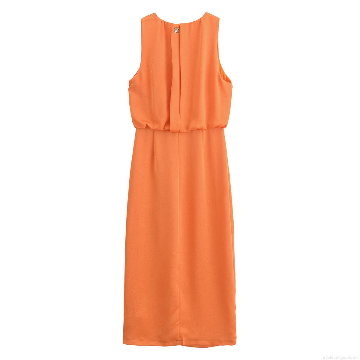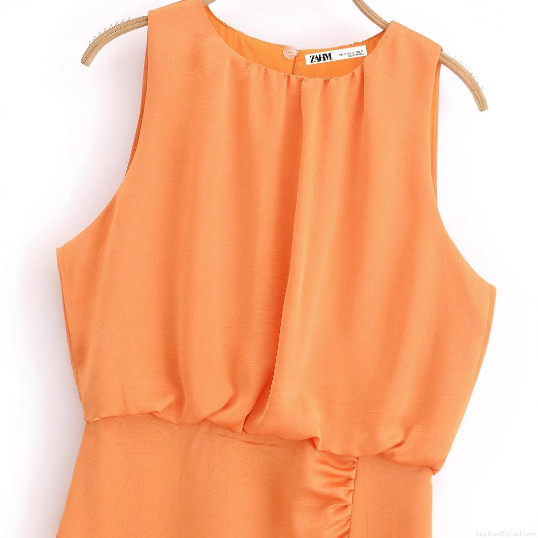 • Elegant Women Sleeveless Pleated Satin Midi Dress Solid Orange Side Slit Crew Neck Chic Party Evening Cocktail Dresses For Lady Summer Wear