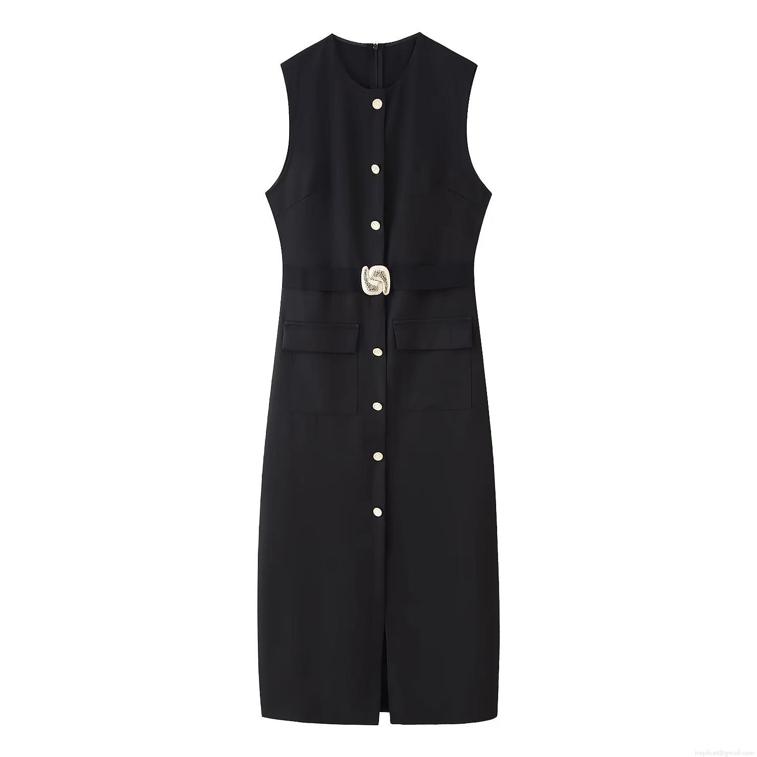 Elegant Women Sleeveless Round Neck Midi Dress With Belt Gold Buttons Solid Color Office Bodycon Dress For Party Wedding Guest Ladys Work Formal Outfit