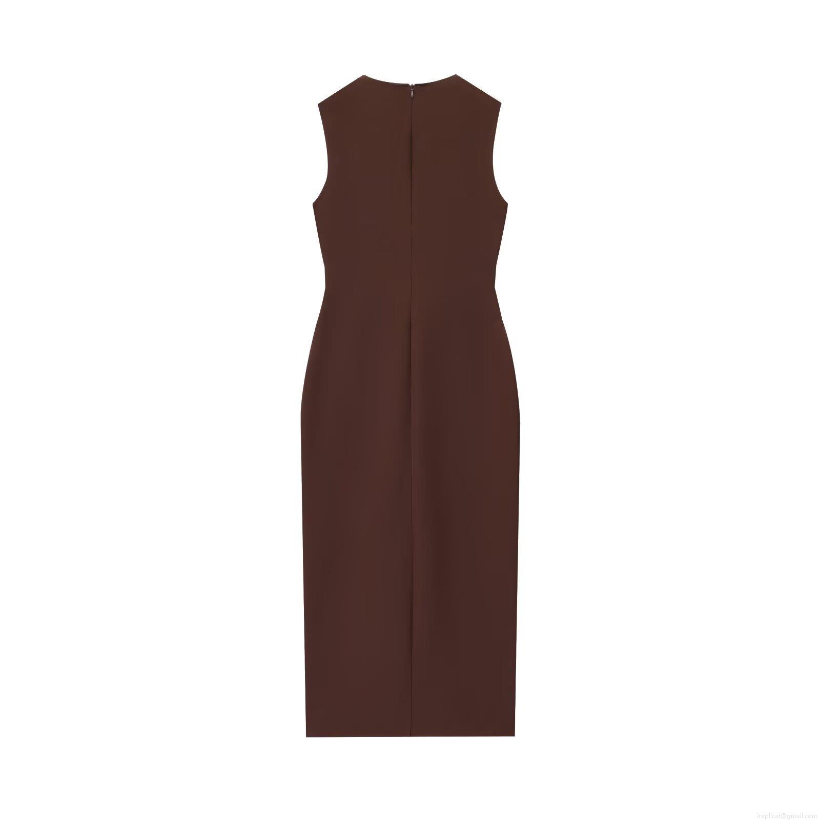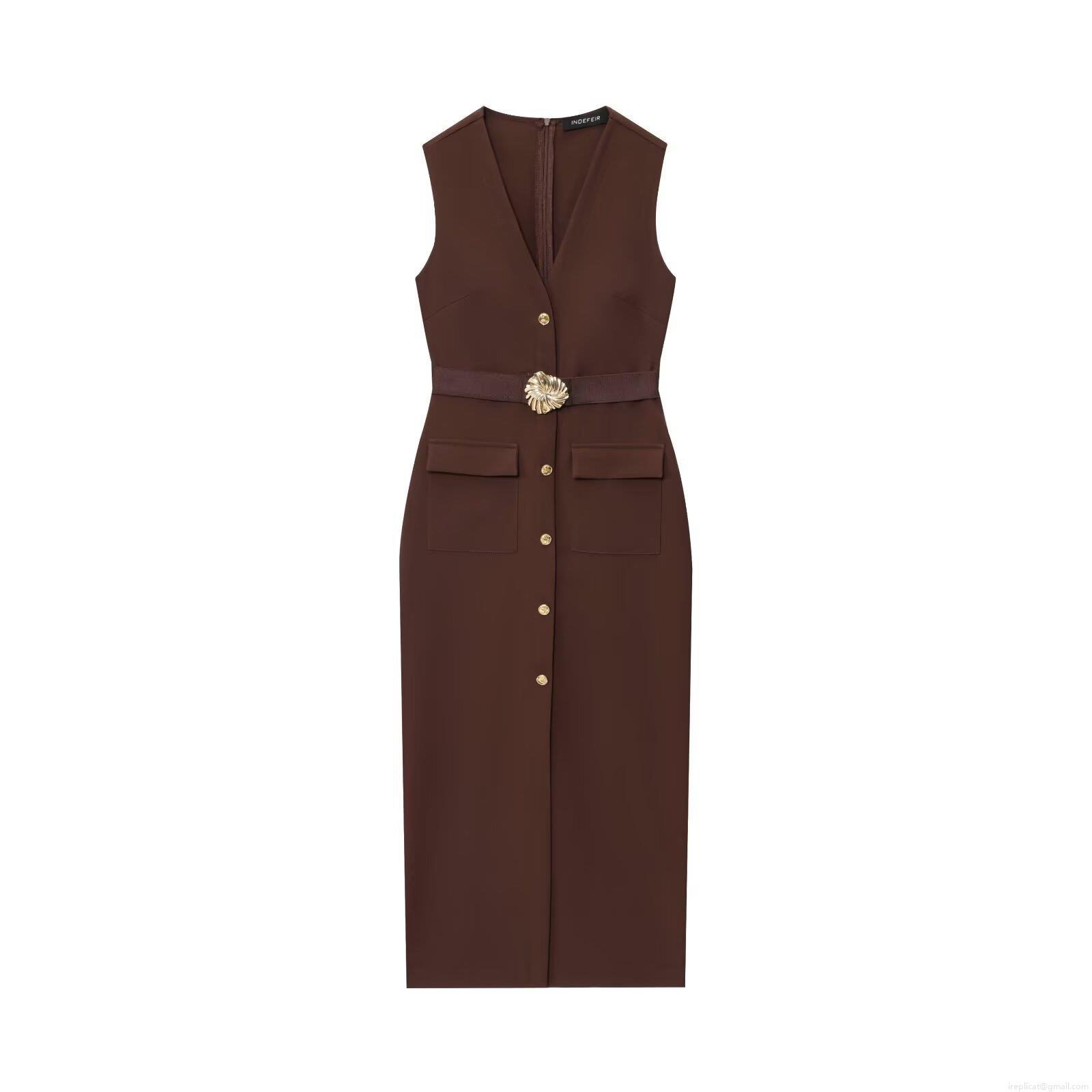 • Elegant Women Sleeveless V-Neck Midi Dress with Belt Gold Flower Buckle Single Breasted Button Polyester Woven Bodycon Work Office Vest Dress