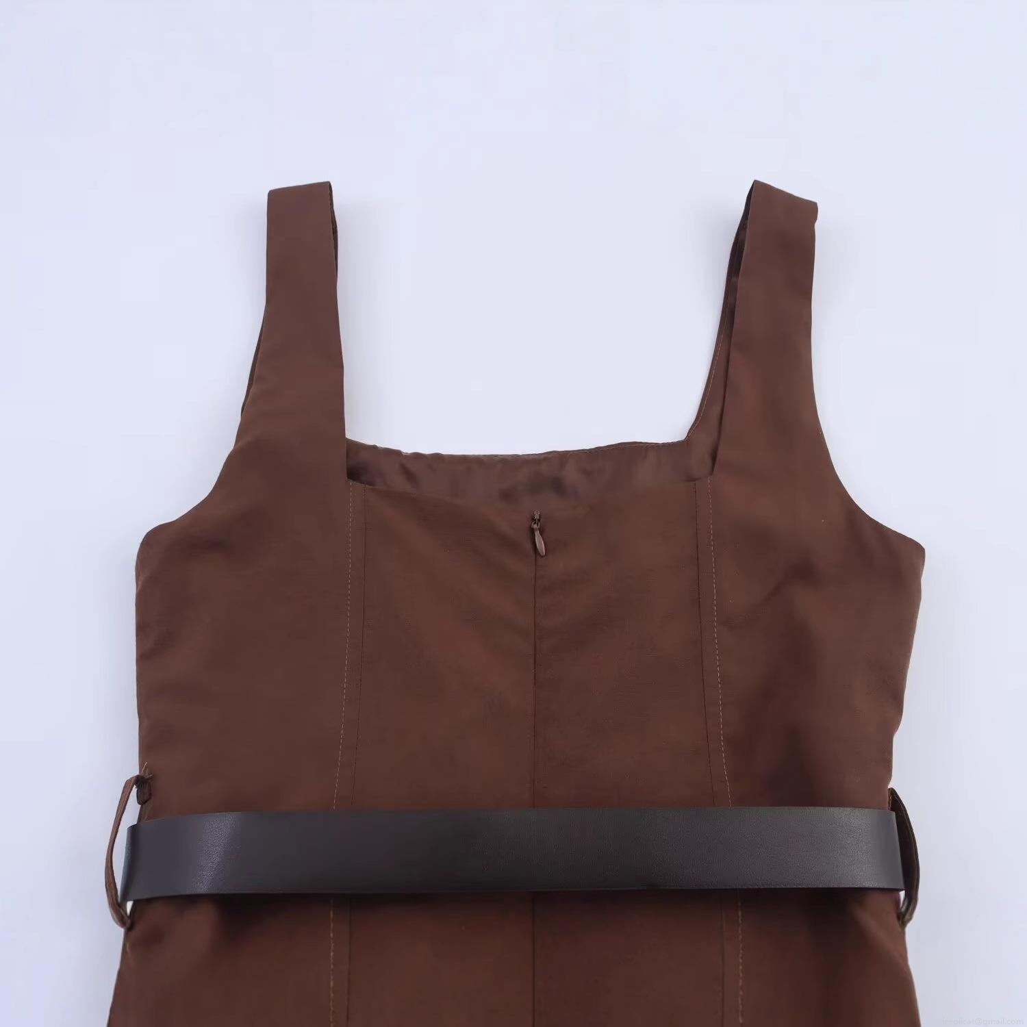 Solid Color, Sleeveless, Square Collar, A-shaped Arrangement, Metal Buckle Belt