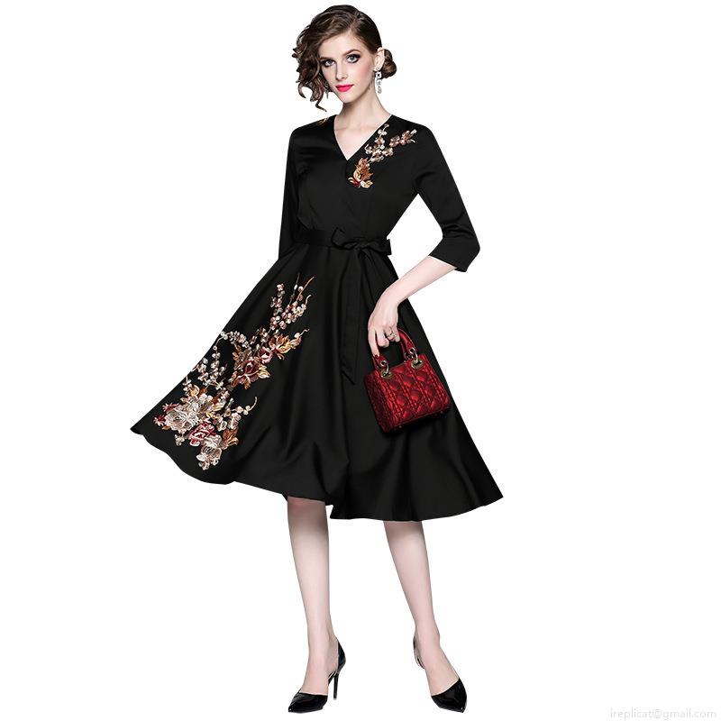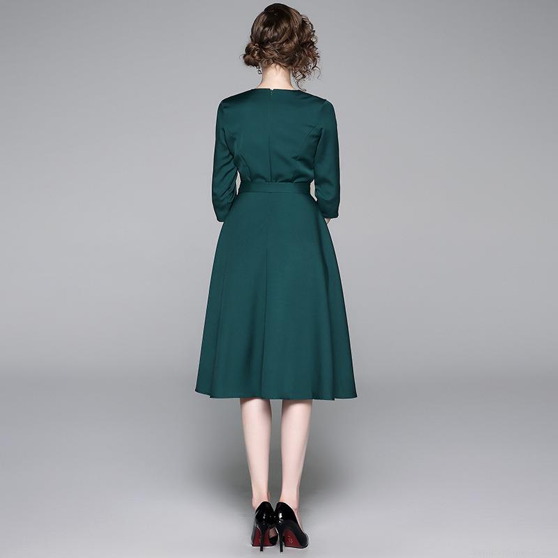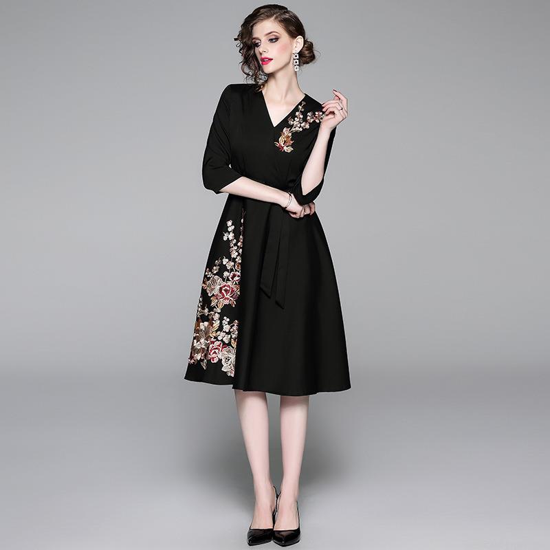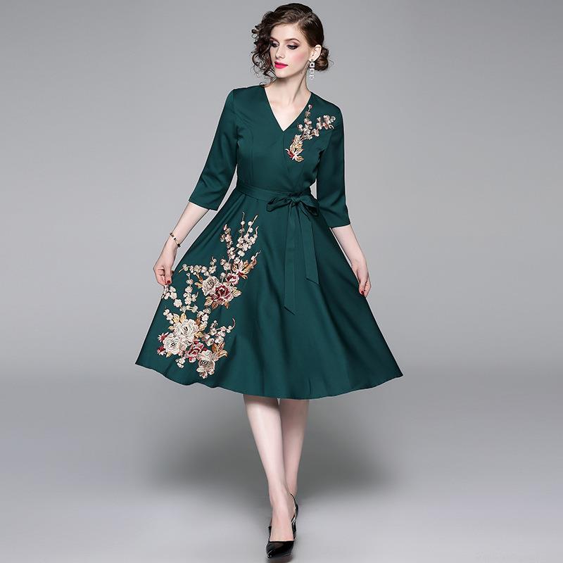 • Elegant Women V Neck Embroidered A-Line Midi Dress With Belt 3-4 Sleeve Polyester Flower Embroidery Banquet Party Evening Dress Slim Fit Lady Fashion Dress