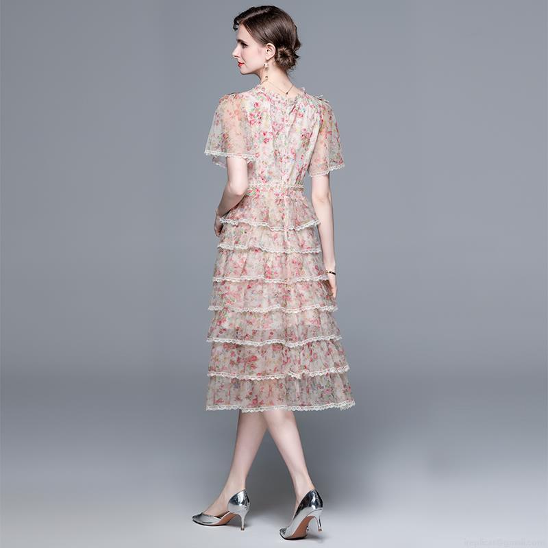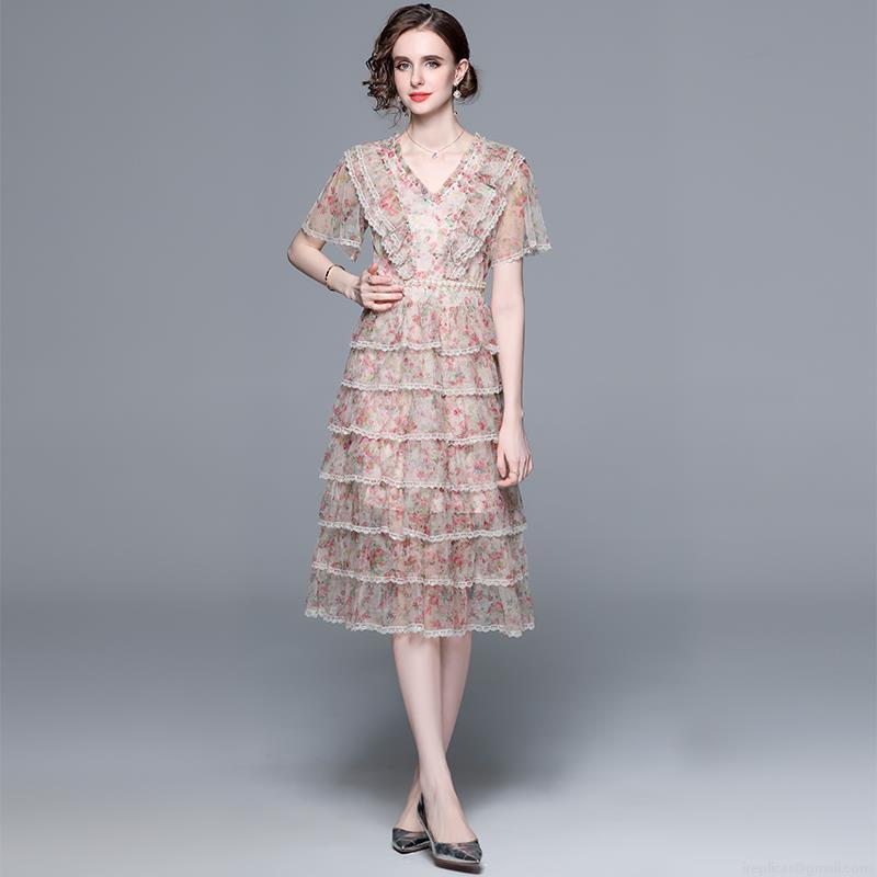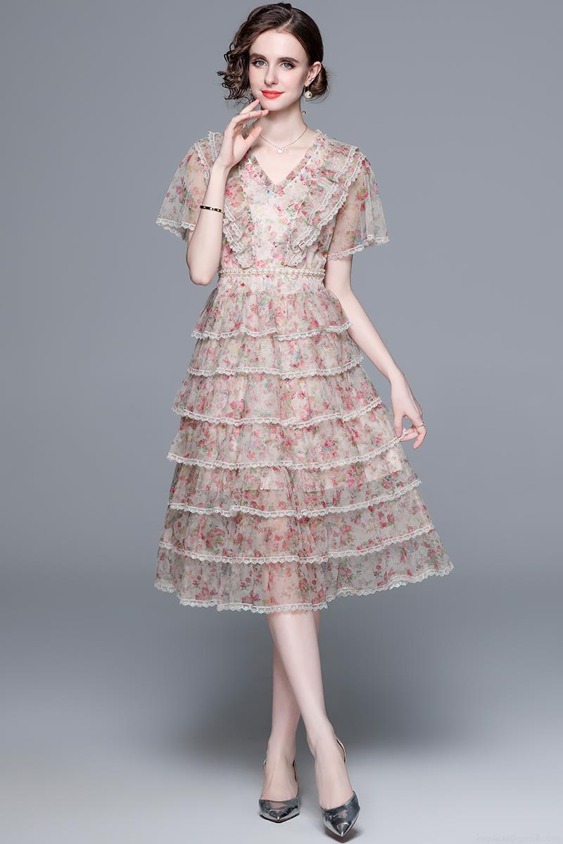 • Elegant Women V-Neck Floral Print Mesh Tiered Cake Midi Dress Beaded Ruffle Short Sleeve French Style Dress For Party Wedding Event