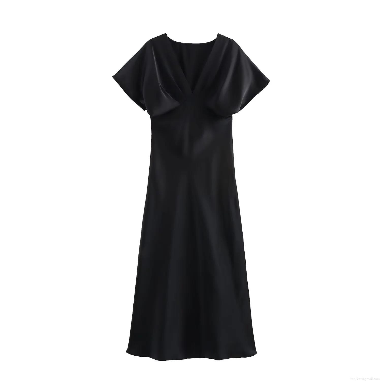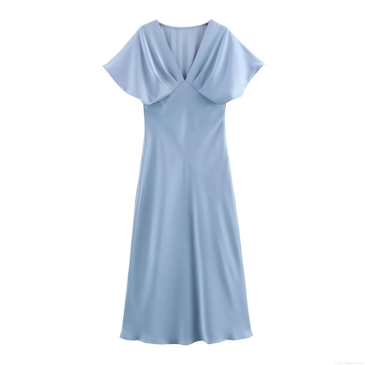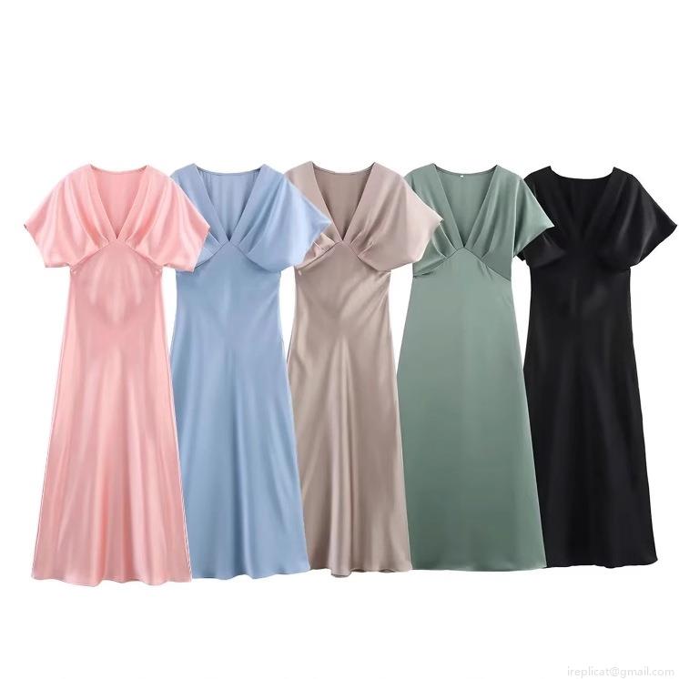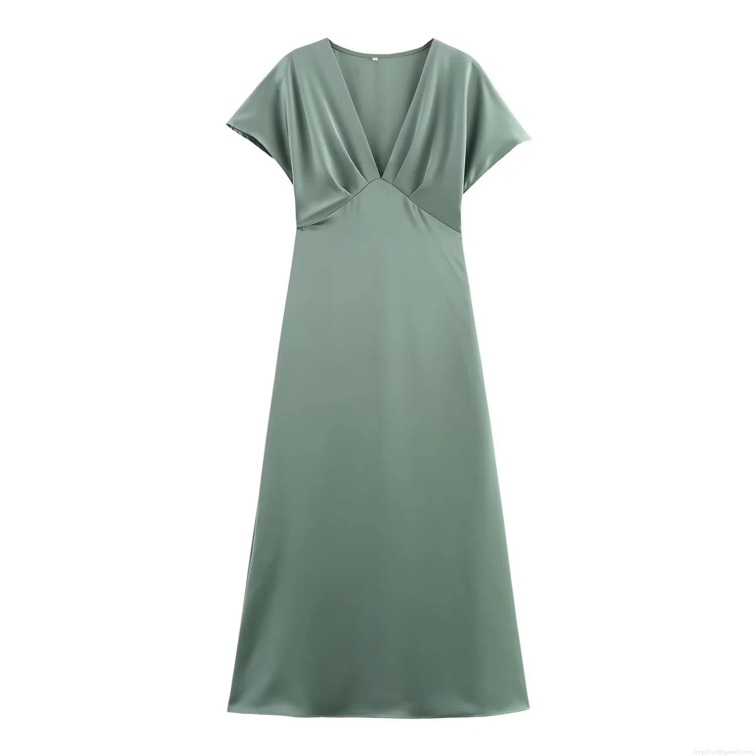 • Elegant Women V-Neck Satin Midi Dress Solid Color Short Sleeve High Waist A-Line Party Banquet Evening Dress For Women