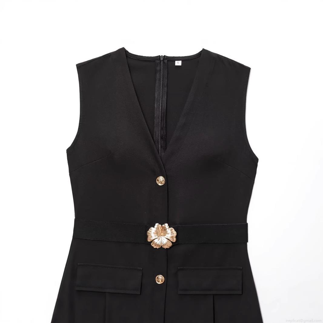 • Elegant Women V-Neck Sleeveless Polyester Bodycon Dress With Gold Lion Head Buttons And Flower Belt Sexy Back Split Midi Dress For Evening Party Date