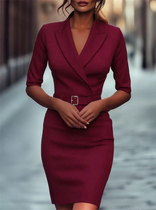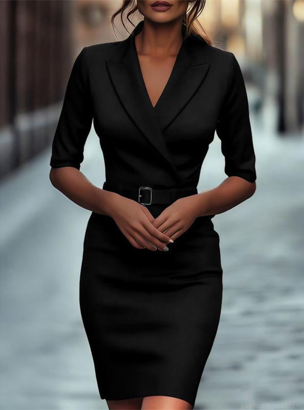 • Elegant Women's Lapel Blazer Dress Solid Color Slim Fit Half Sleeve Commuting Midi Dress With Waist Tie Belt For Office Work Business Party