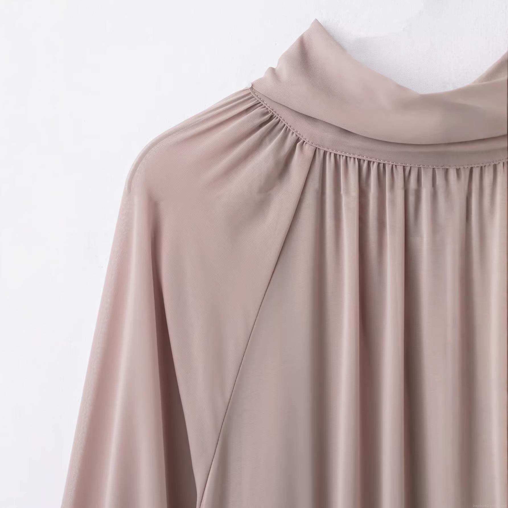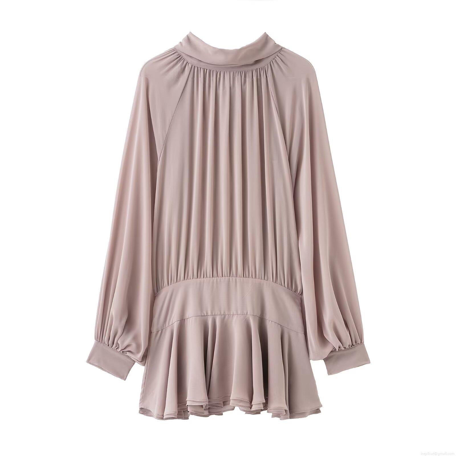 • Elegant Women's Long Sleeve Round Neck Chiffon Dress With Bow Tie Waist Ruffle Hem Vintage European Style Solid Lotus Pink Midi Dress
