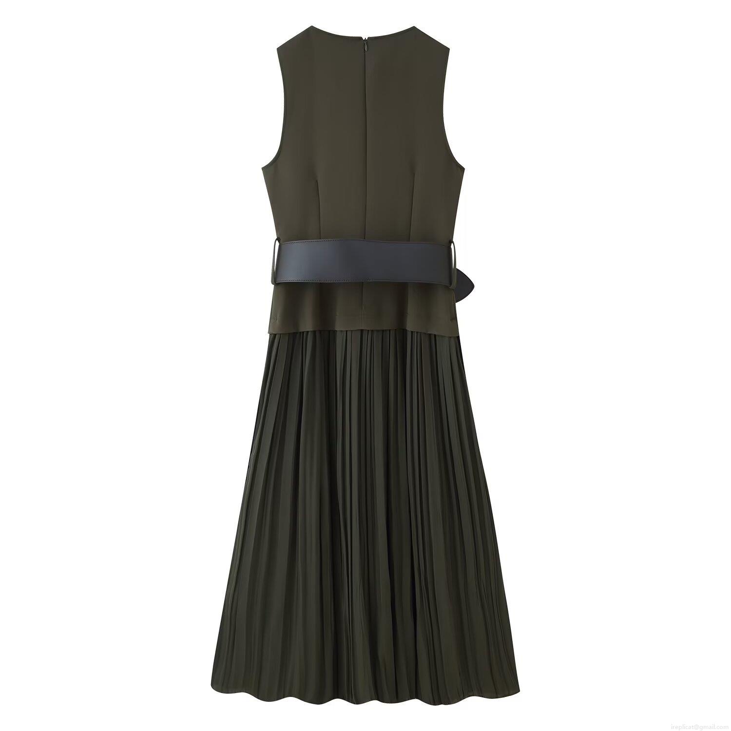 Elegant Women's Olive Green Sleeveless Midi Dress With Black PU Belt Gold Lion Head Buttons Pleated Skirt For Banquet Party Evening Socialite Style