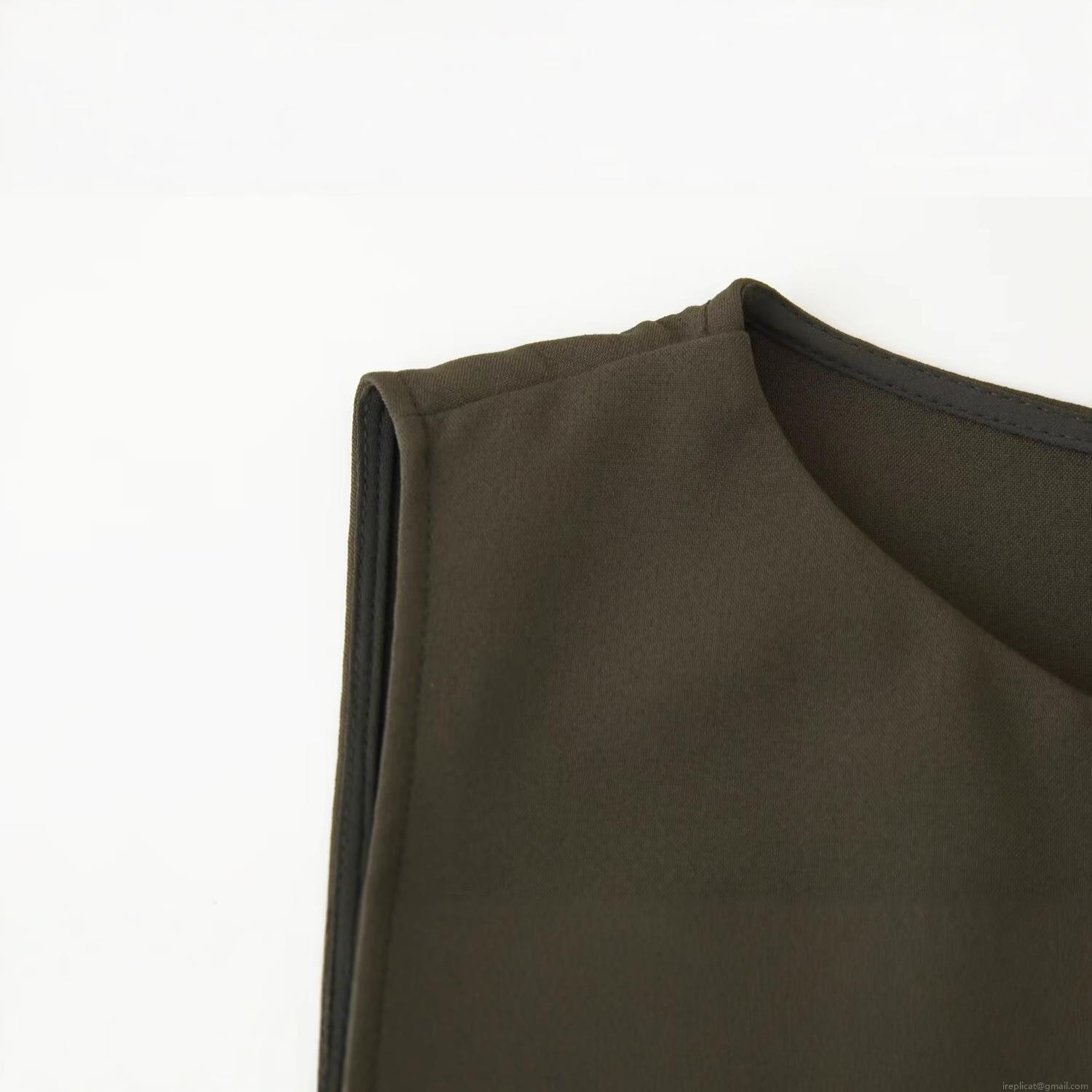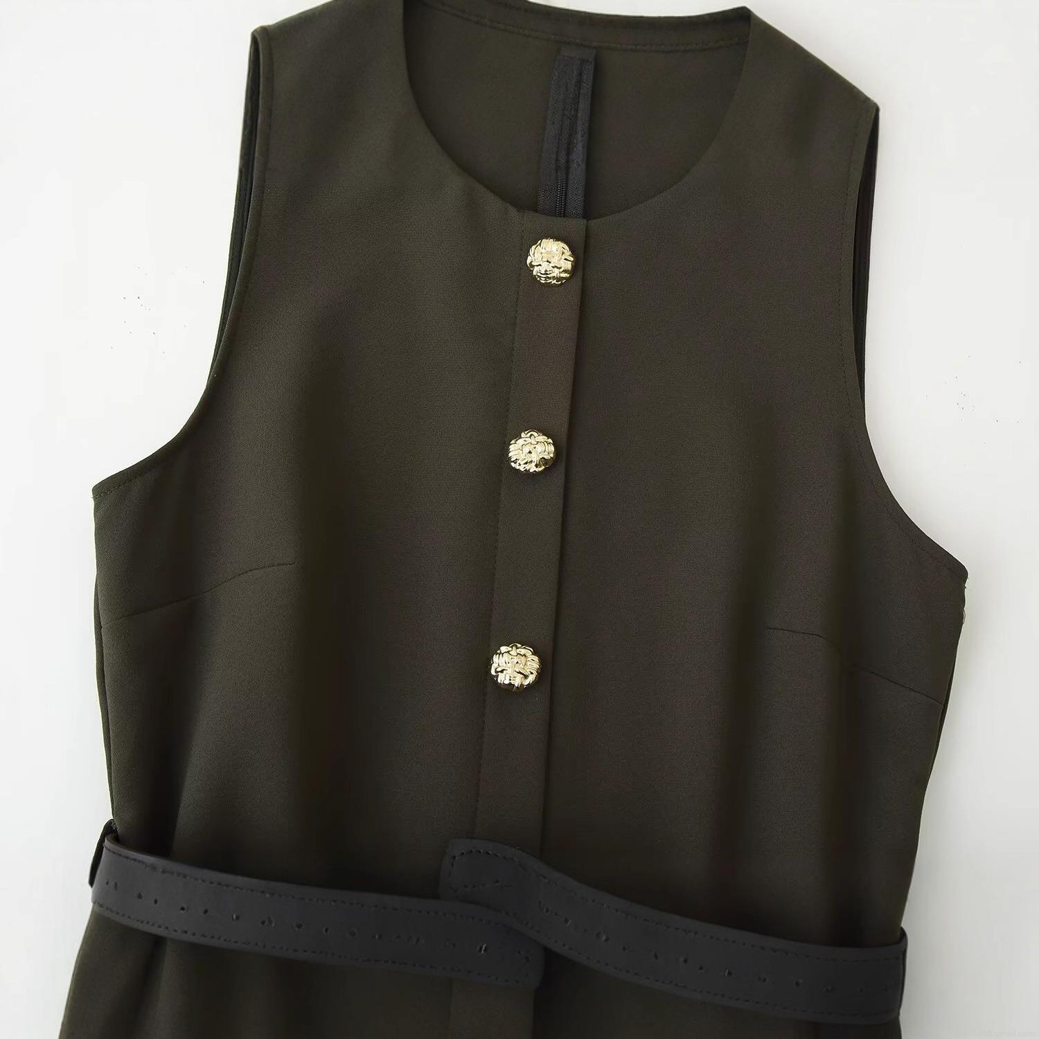 • Elegant Women's Olive Green Sleeveless Midi Dress With Black PU Belt Gold Lion Head Buttons Pleated Skirt For Banquet Party Evening Socialite Style