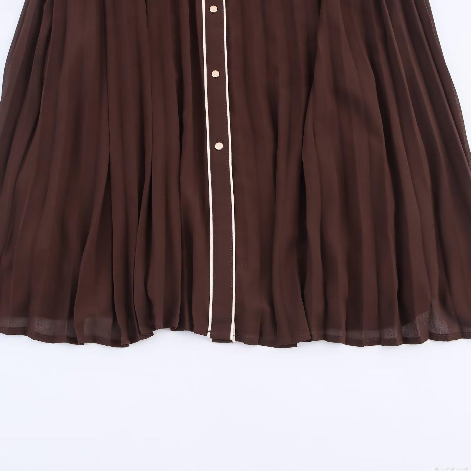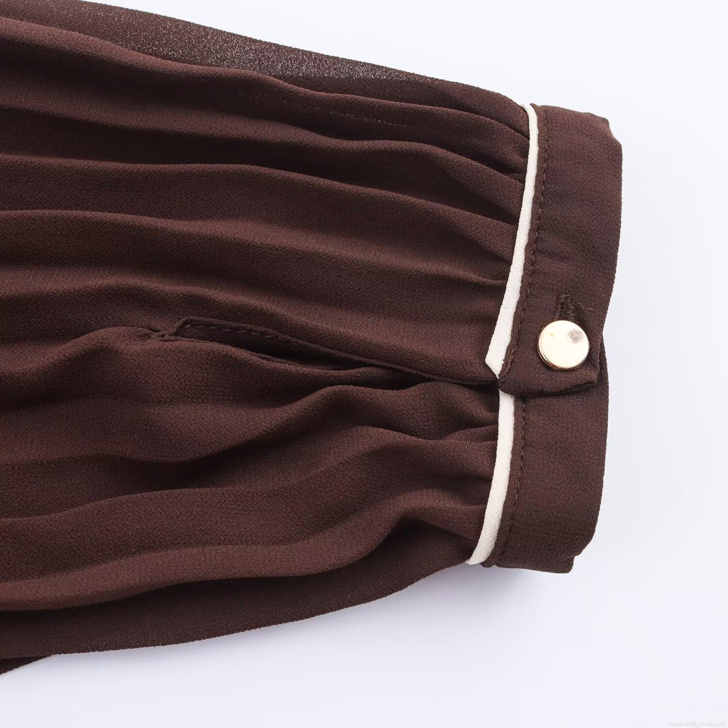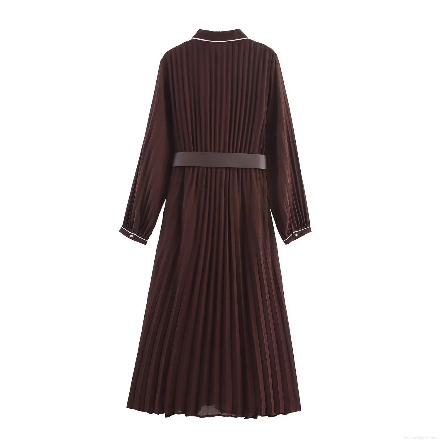 • Elegant Women's Pleated Midi Dress Long Sleeve Polyester Chiffon Shirt Collar Dress With Belt Contrast Piping Design Solid Coffee Office Commute Dress