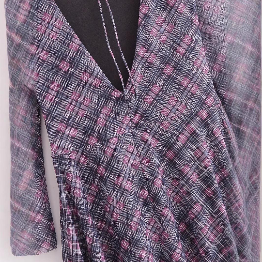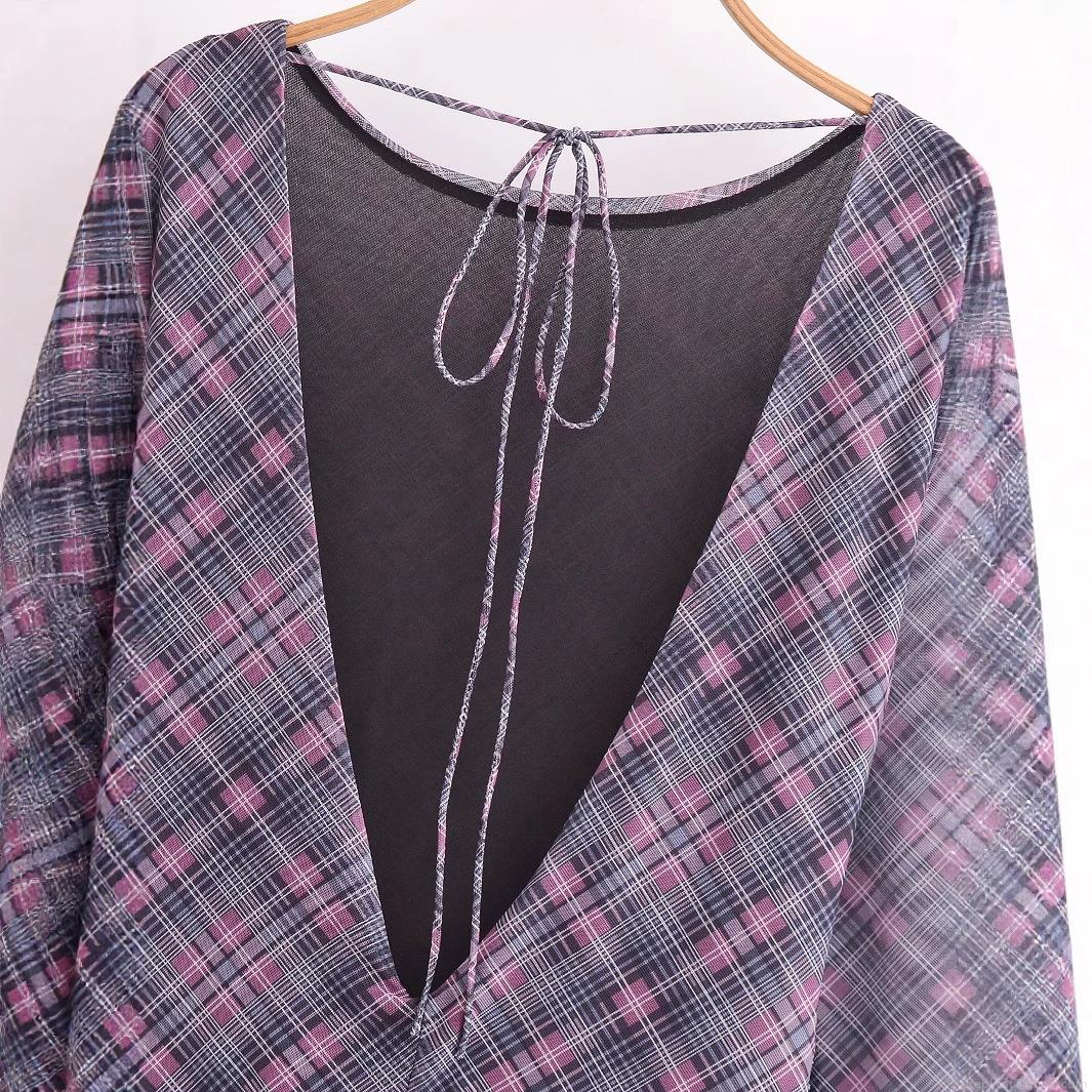 • Elegant Women's Purple Plaid Mesh Dress Backless V-Neck Lace-Up Asymmetric Hem Ruffle Long Sleeve Polyester Dress For Party Fashion