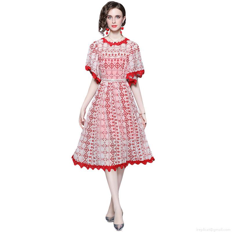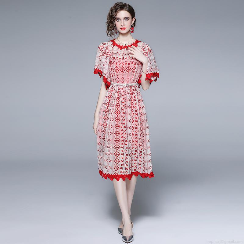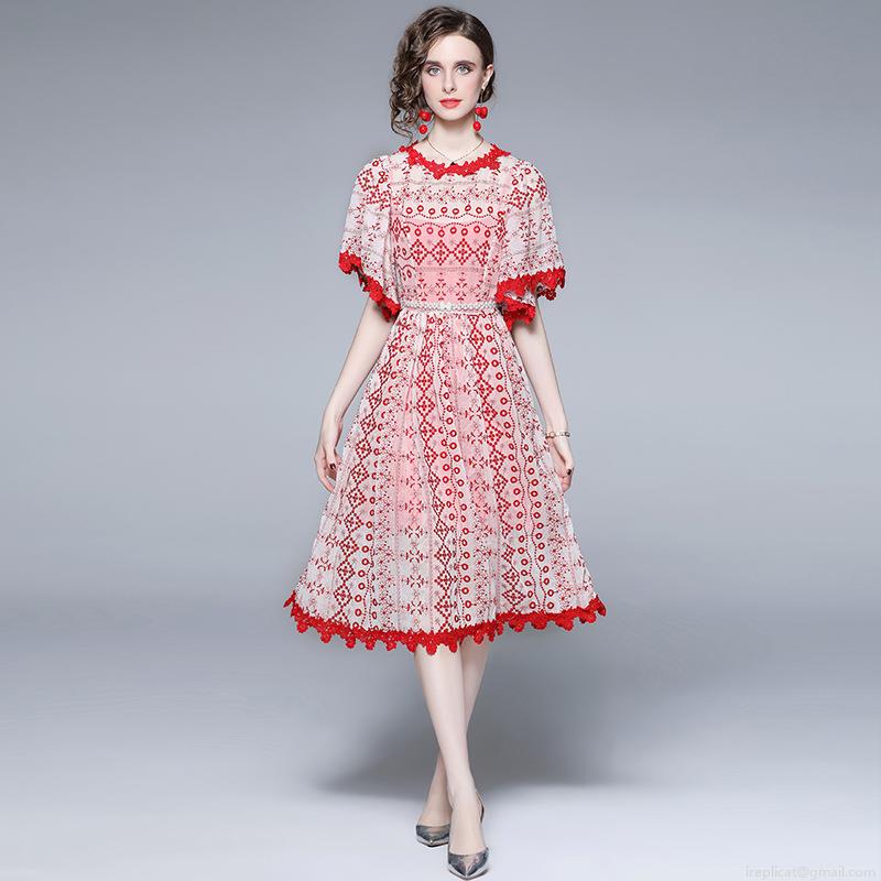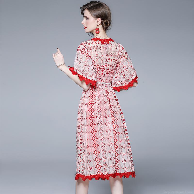• Elegant Women's Red Lace Embroidered Midi Dress Round Neck Flare Sleeve A-Line Party Dress With Pearl Belt Celebrity Style Fall Winter Slim Fit Office Outfits