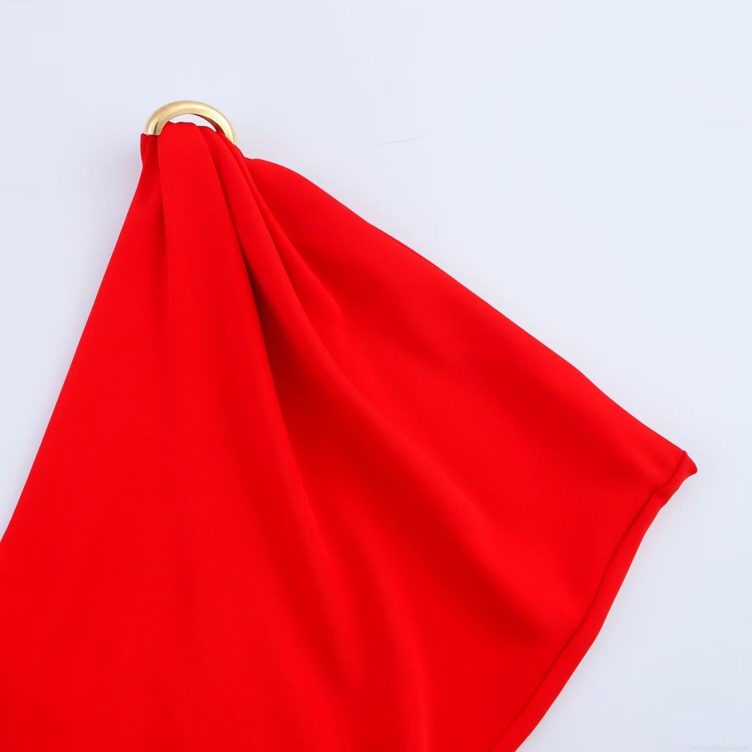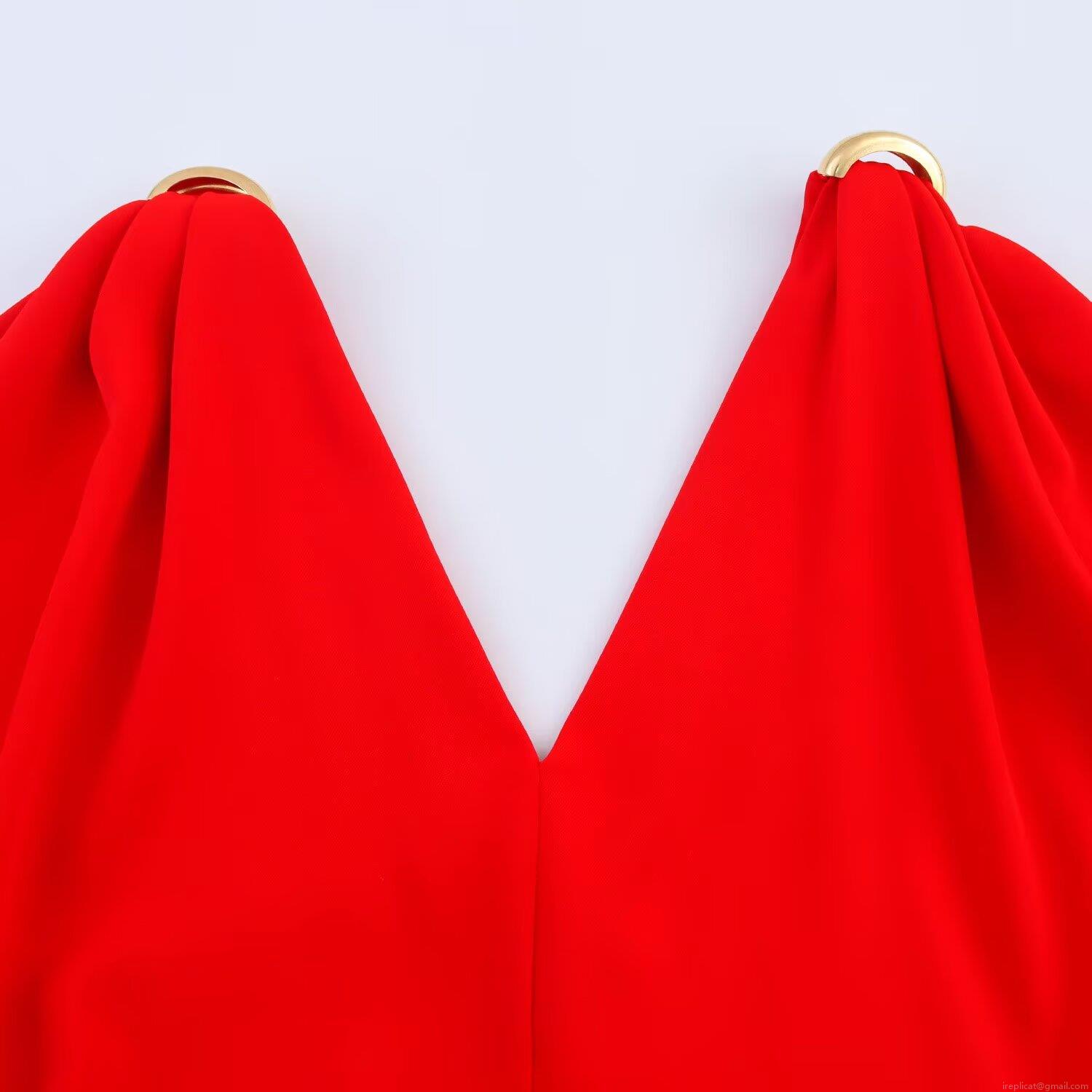 Elegant Women's Red Midi Bodycon Dress Satin Polyester Fabric Deep V-Neck Ruffle Butterfly Sleeve With Gold Metal Ring Luxury Party Evening Cocktail Gown