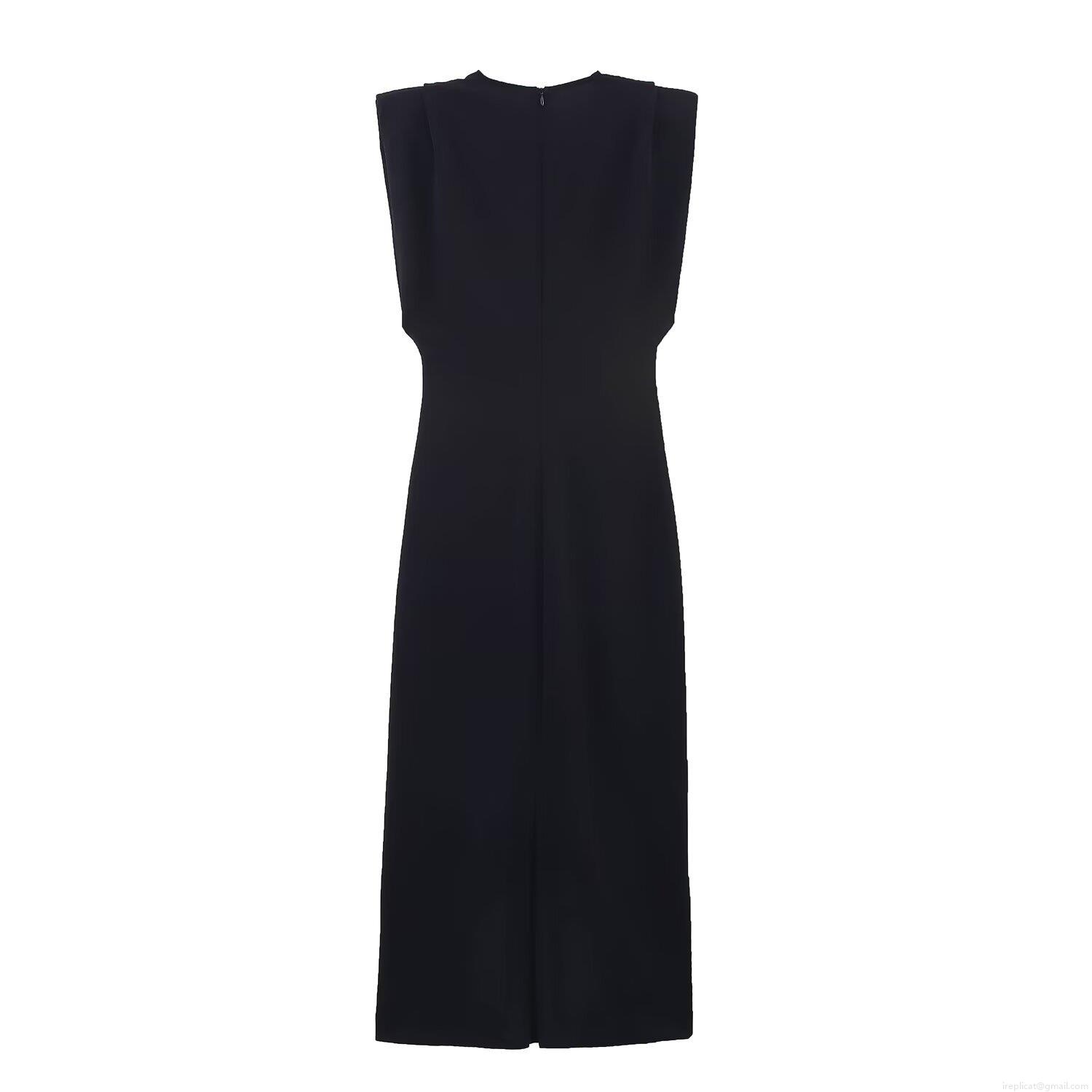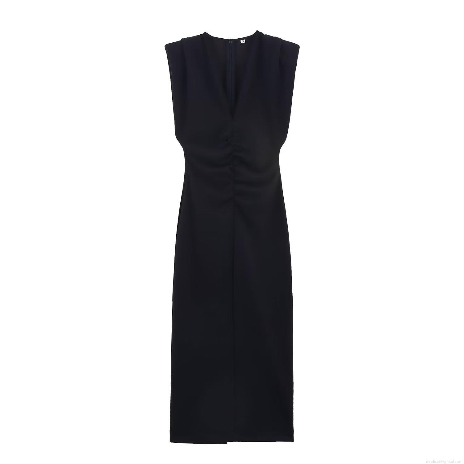 • Elegant Women's Sleeveless Shoulder Padded Midi Dress Deep V-Neck Ruched Waist Polyester Evening Party Cocktail Bodycon Long Dress