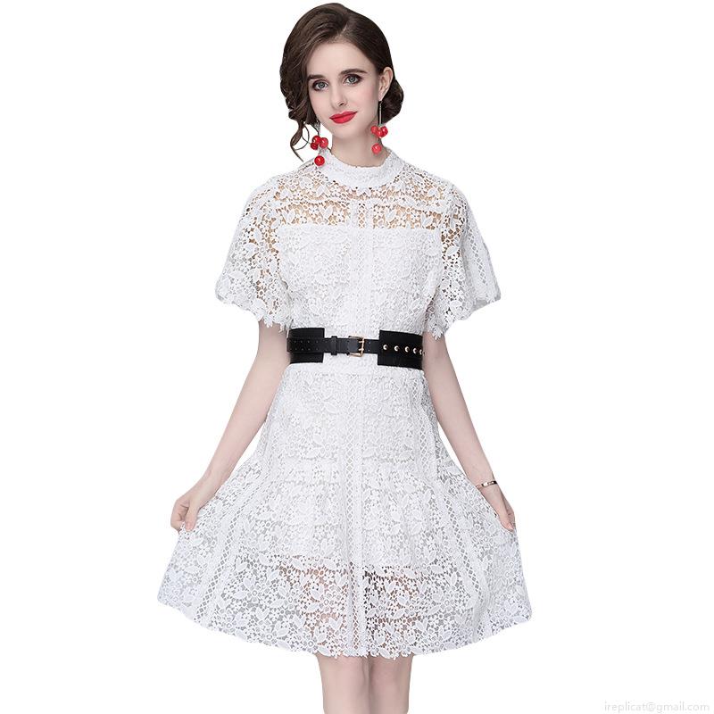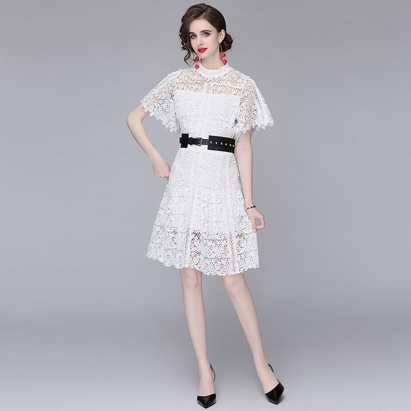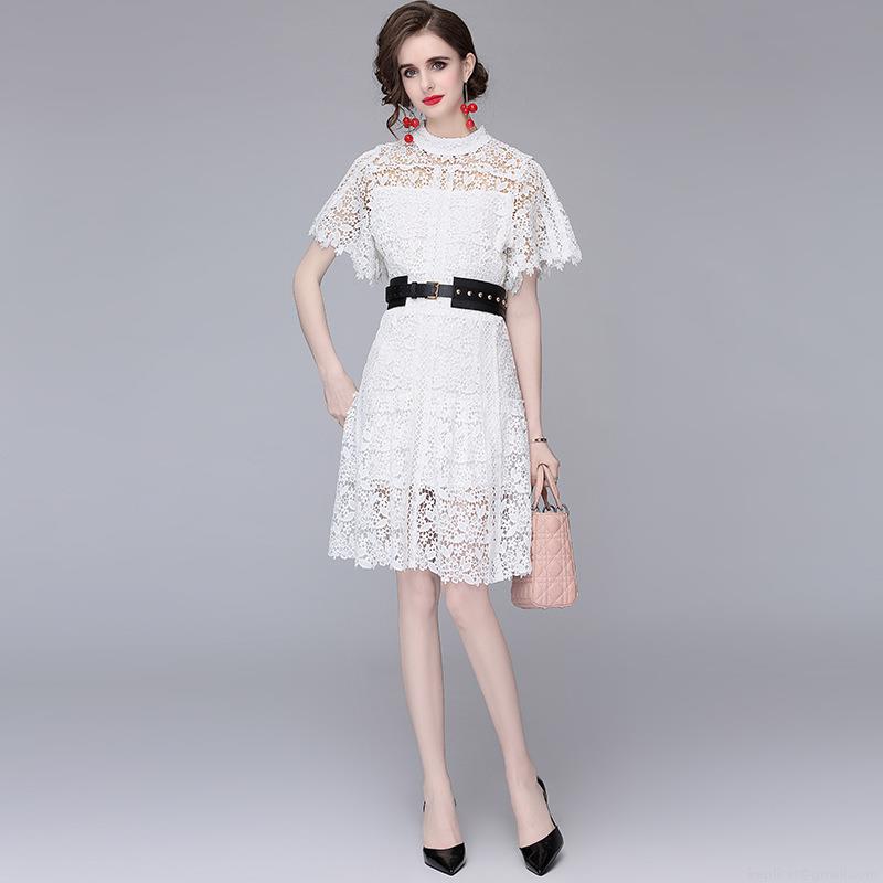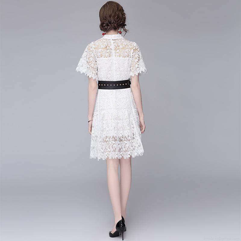 • Elegant Women's White Lace Midi Dress Hollow Out Floral Embroidery A-Line Dress with Black Rivet Belt Stand Collar Short Sleeve Cocktail Party Prom Dress