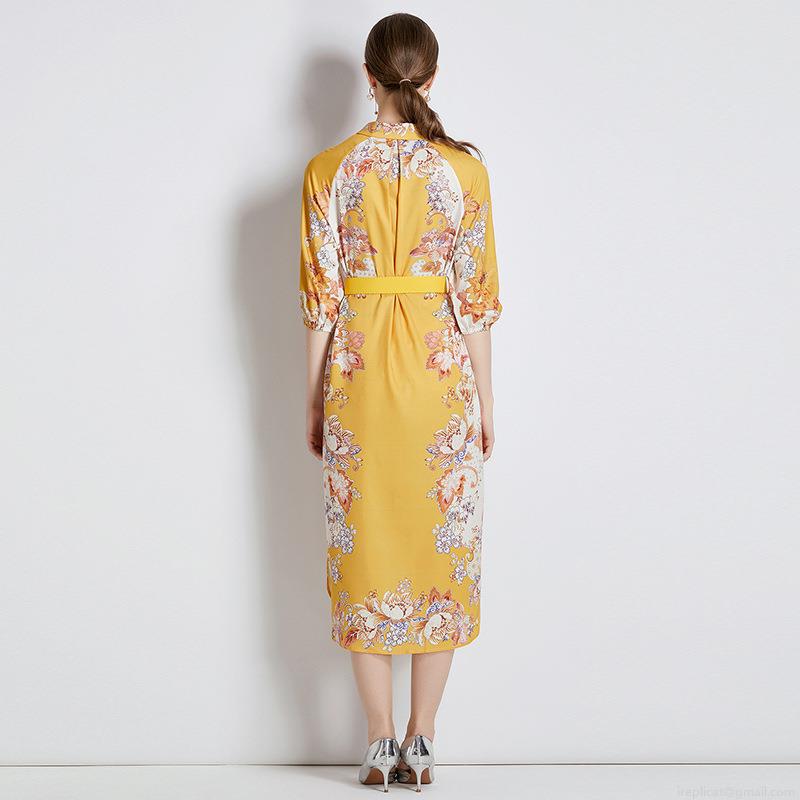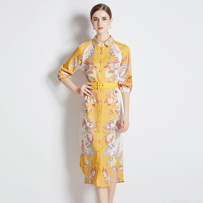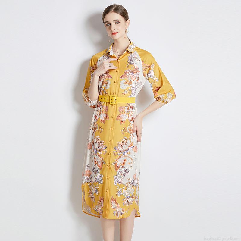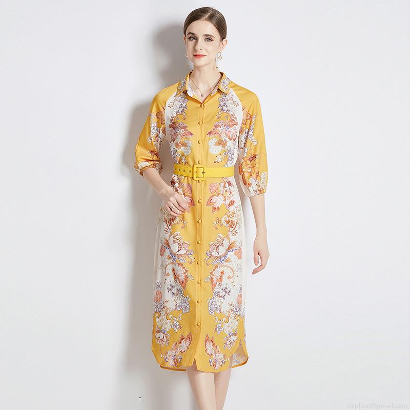 • Elegant Yellow Floral Print Shirt Dress For Women Turn-down Collar Single Breasted Midi A-Line Dress With Belt 3/4 Sleeve Polyester Comfortable Breathable Summer Casual Clothing