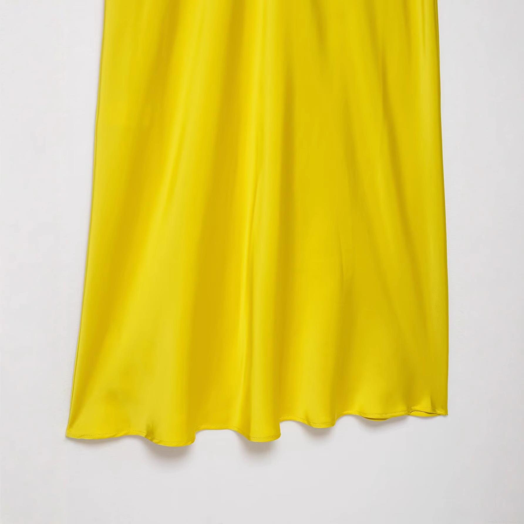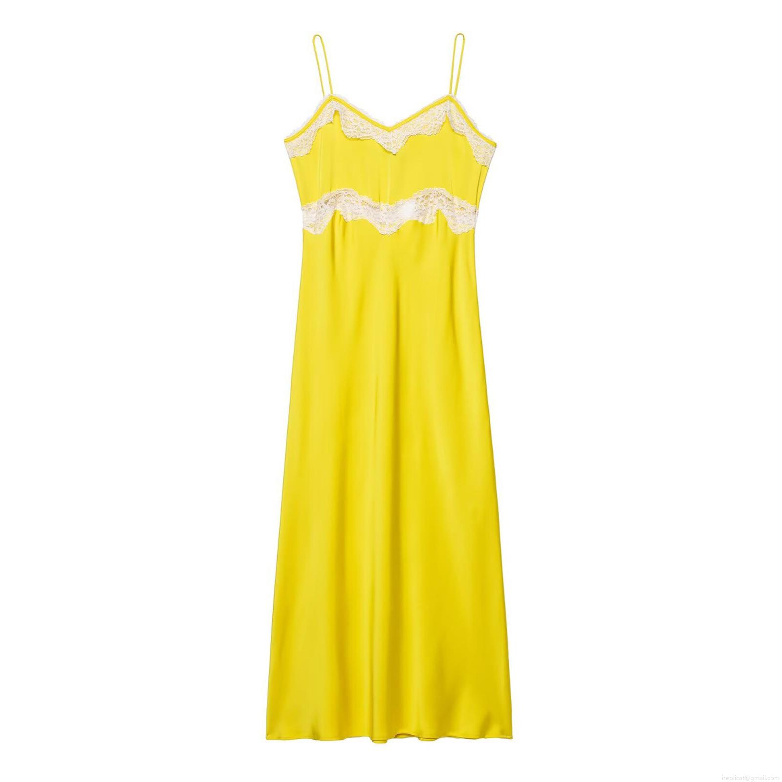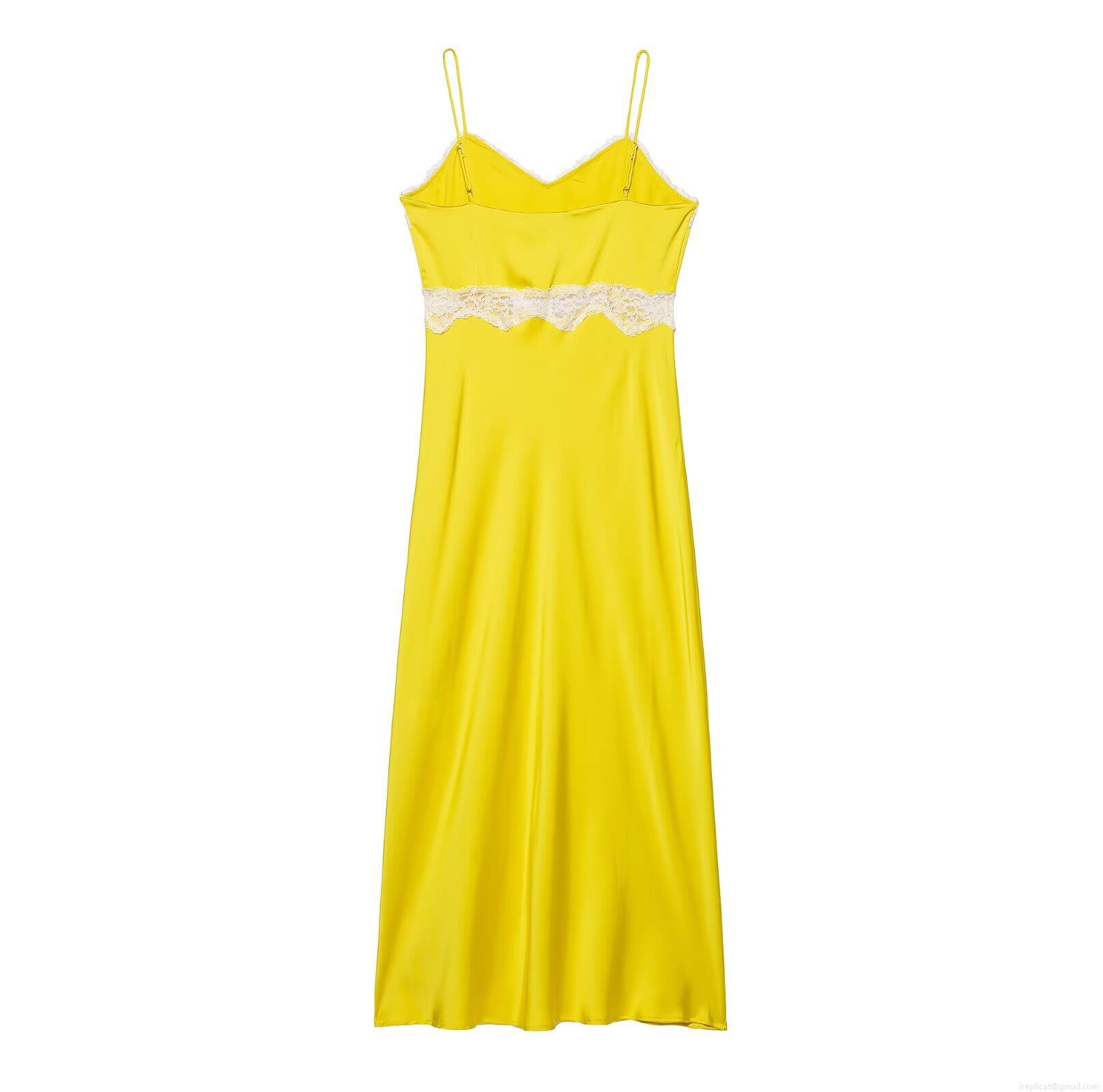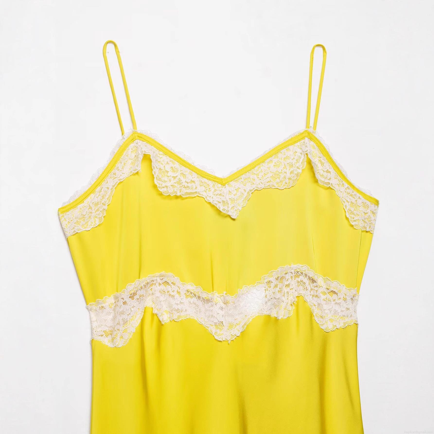 • Elegant Yellow Satin Midi Dress With White Lace Trim Spaghetti Straps V-Neck Sleeveless Cocktail Party Evening Dress For Women Summer Fashion Elegant Style