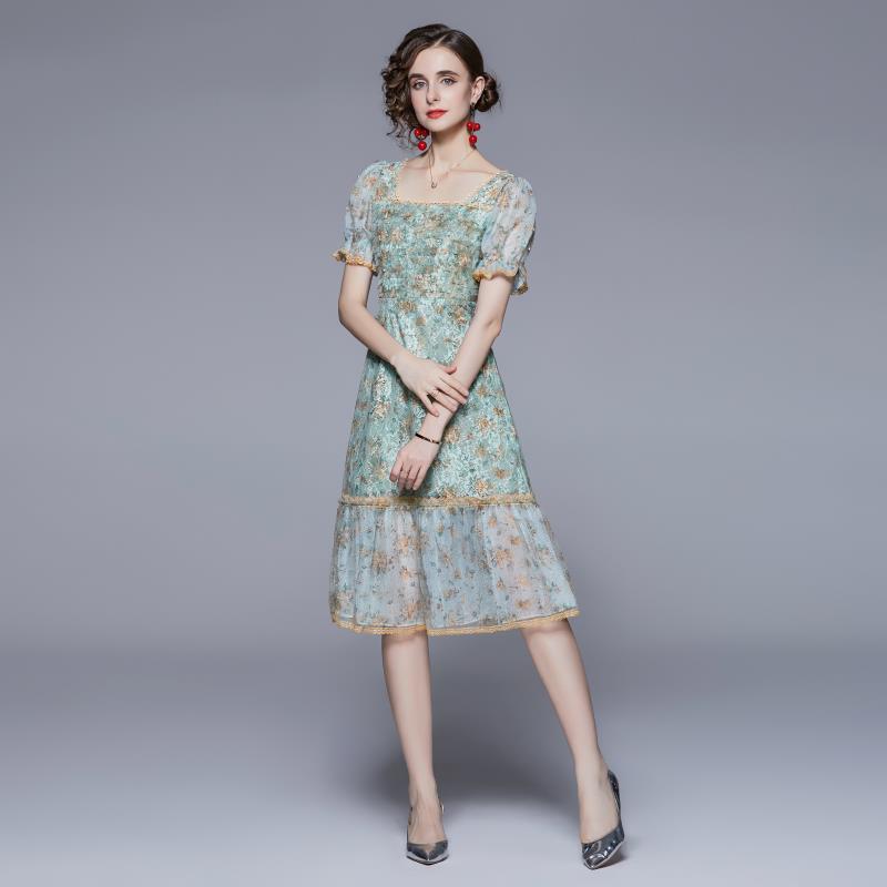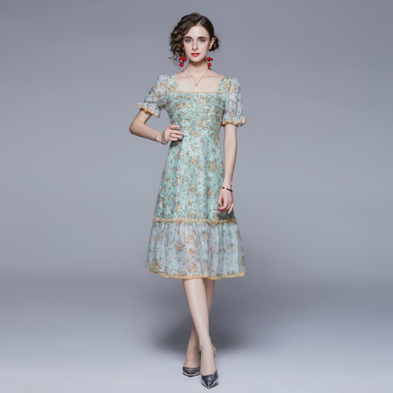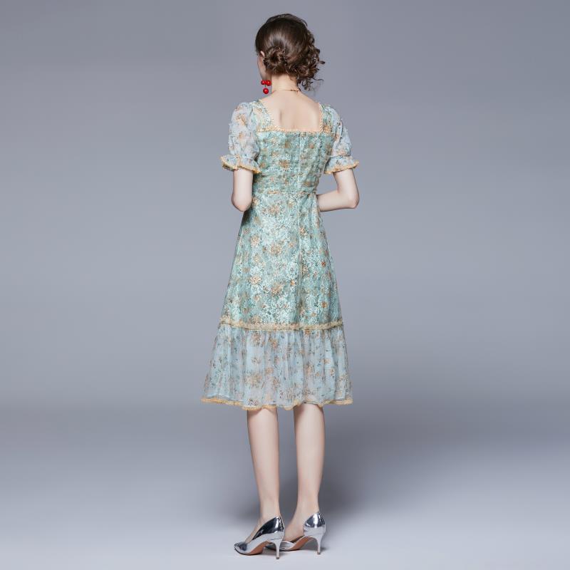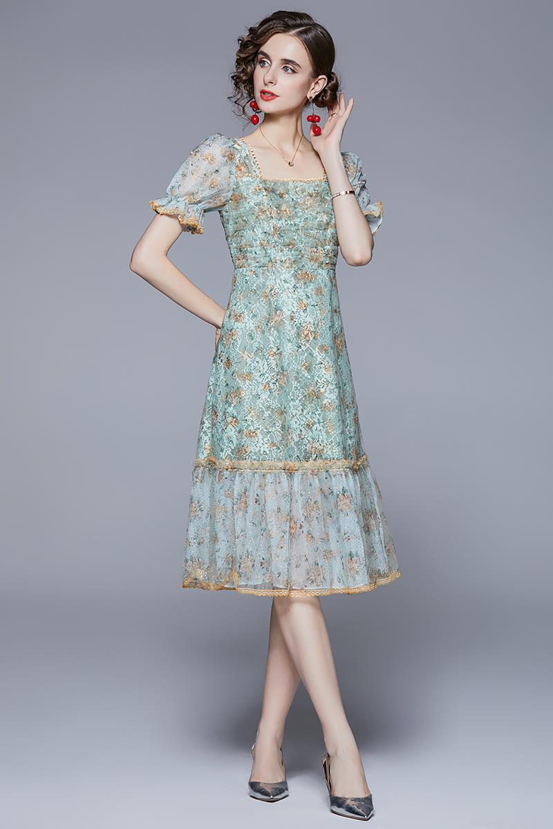 • French Elegant Floral Lace Midi Dress For Women Summer Square Neck Puff Sleeve High Waist A-Line Mesh Embroidery Dress With Pearl Rhinestone Detail