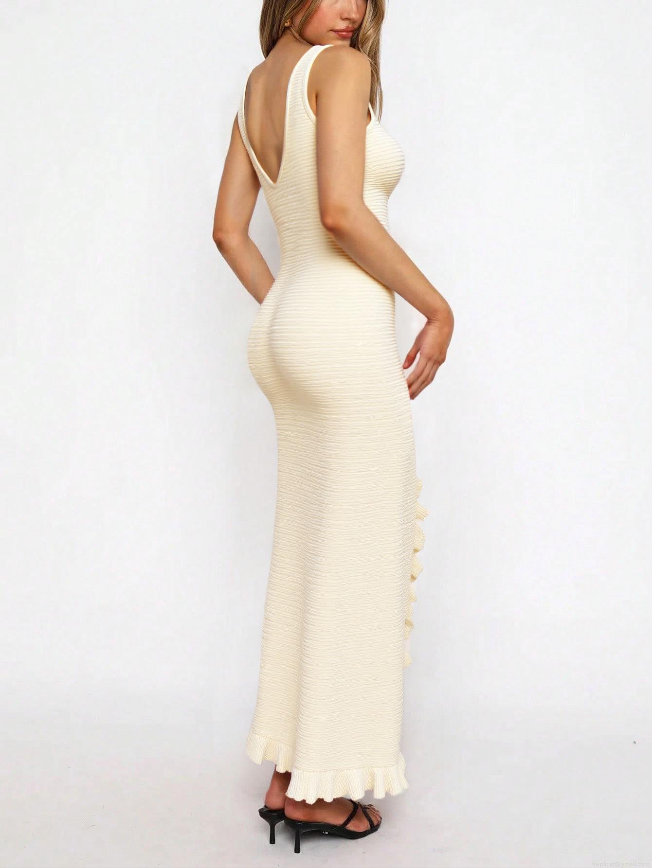 • French Elegant V-Neck Backless Sleeveless Dress Women Summer Sexy Ruffle High Slit Pleated Bodycon Midi Dress For Vacation Party Polyester Elastane Dress