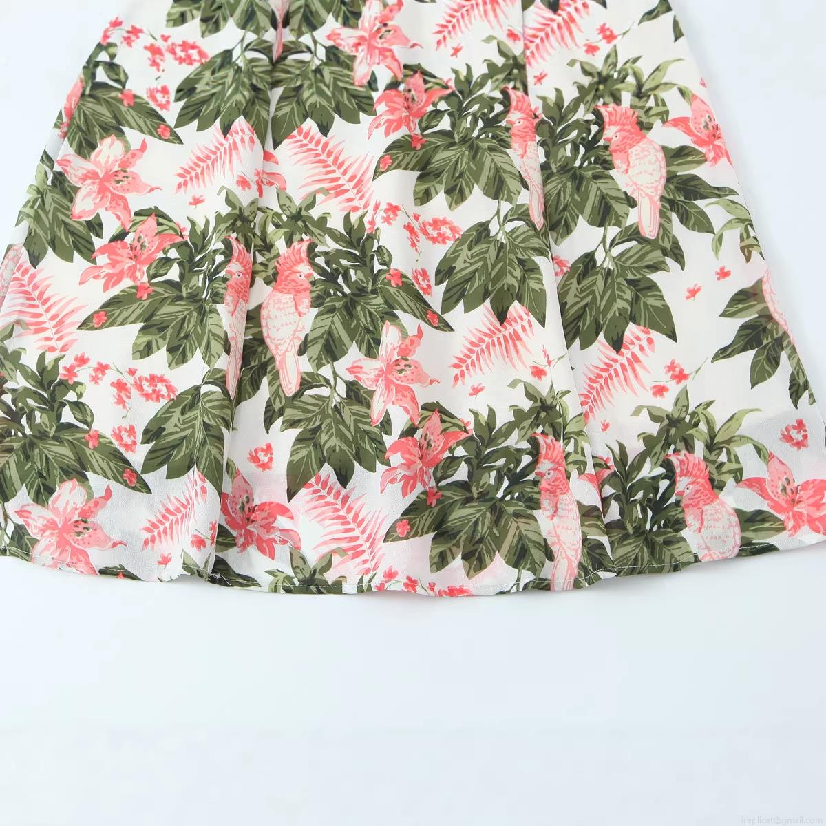 Parrot, Tropical Plants, Floral Pattern, Lily, Palm Leaves, Off-shoulder, Full Skirt, Bow Strap, Elastic Back Brace