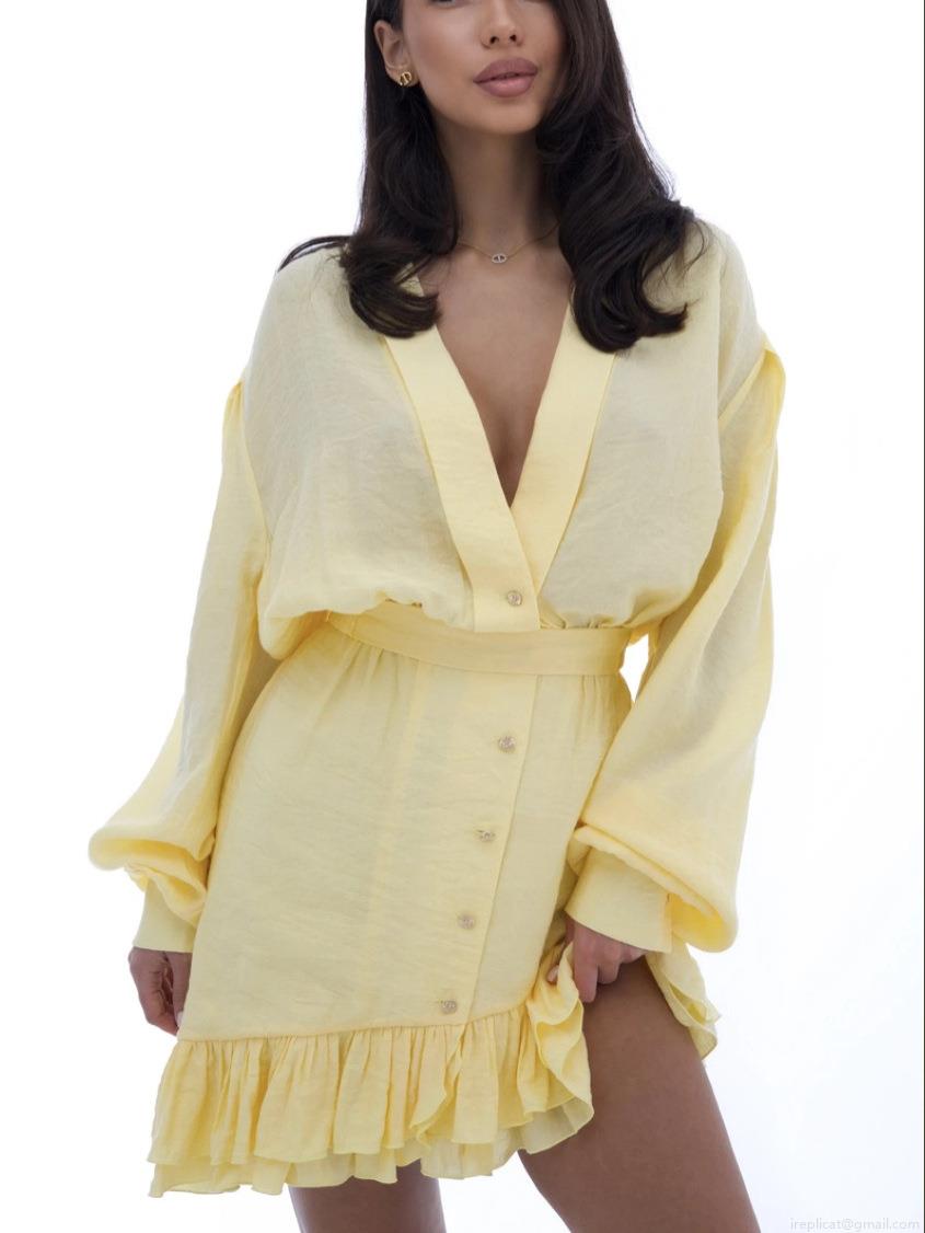 French Gentle Style Women V-Neck Long Sleeve 100% Cotton Dress Ruffle Button High Waist Midi Dress Elegant Vacation Beach Short Skirt For Ladies