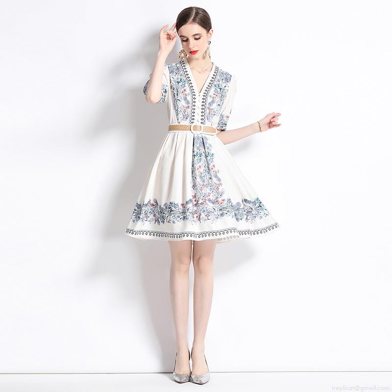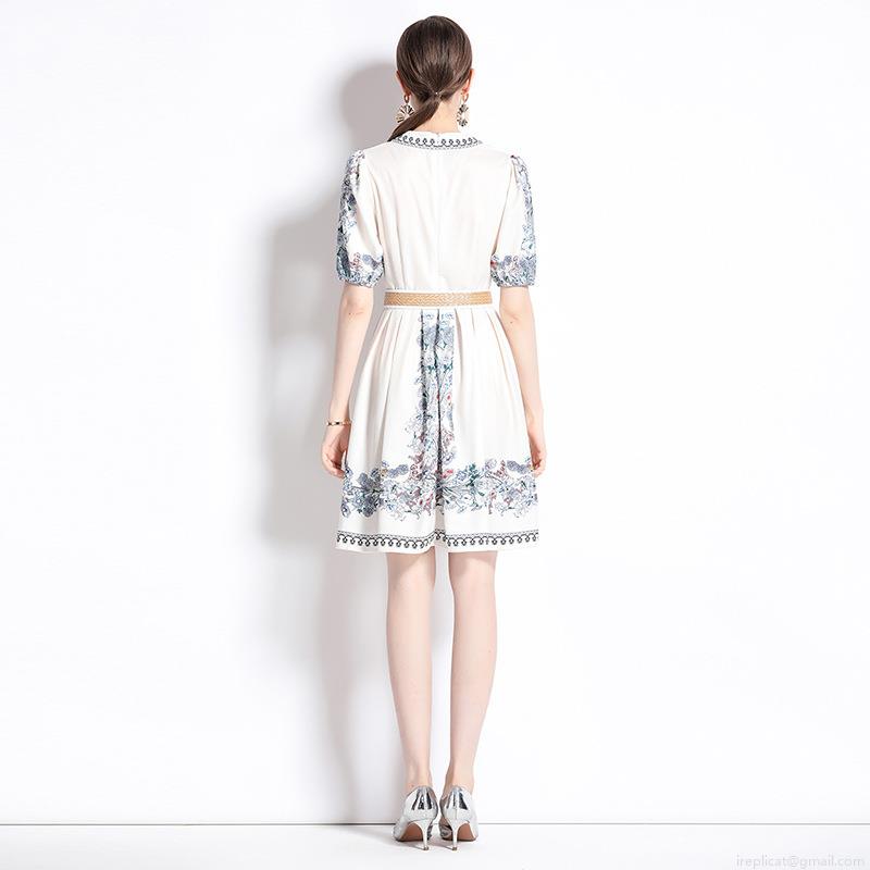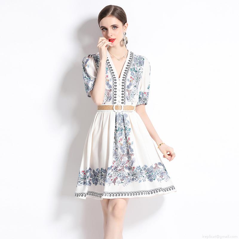 • French Retro V-Neck Floral Print Midi Dress With Straw Belt Acetate Fiber Short Puff Sleeve A-Line Button Front Summer Dress For Women Elegant Vacation Style