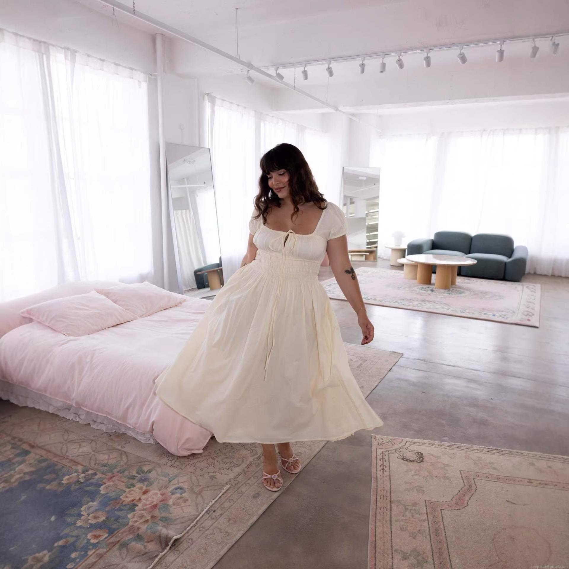 • French Rural Style Square Neck Puff Sleeve Midi Dress Elegant Smocked Waist Backless Lace-up A-line Cotton Dress For Women Vacation Daily Wear
