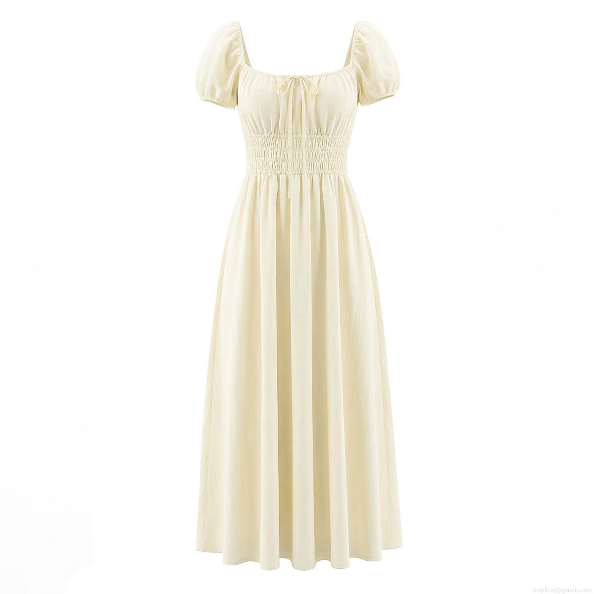 French Rural Style Square Neck Puff Sleeve Midi Dress Elegant Smocked Waist Backless Lace-up A-line Cotton Dress For Women Vacation Daily Wear