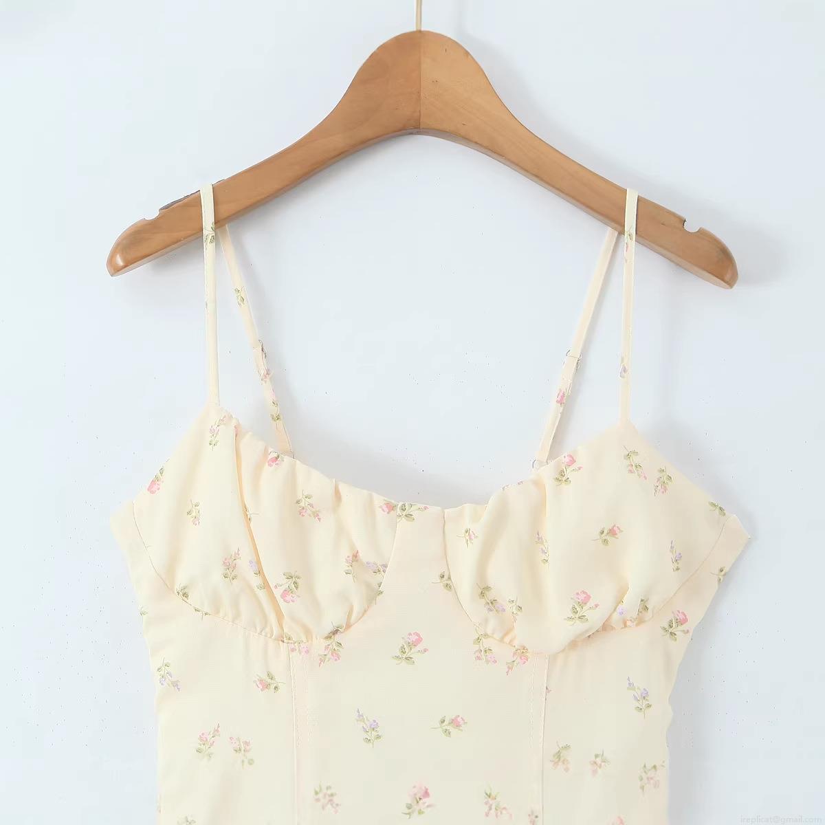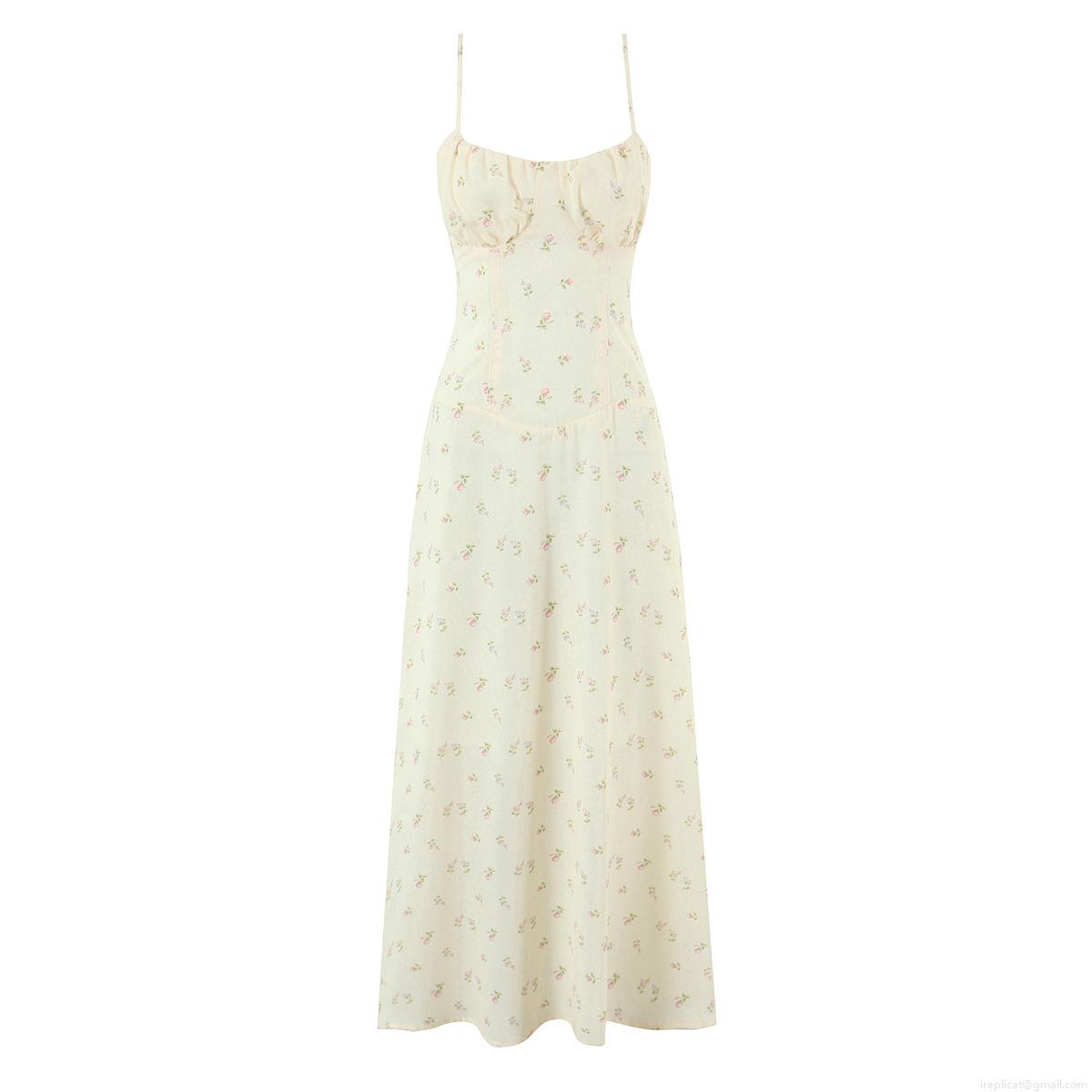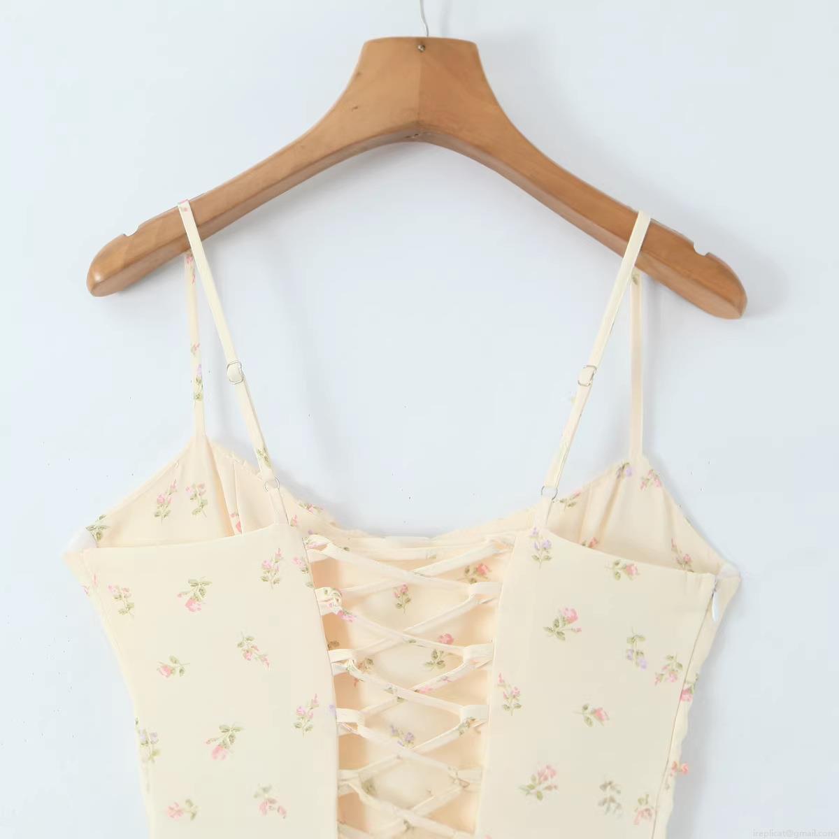 French Vintage Floral Print Slip Dress Summer Women 100% Polyester Lace-up Back Slim Fit Midi Dress For Daily Holiday Ladies Fashionable Streetwear