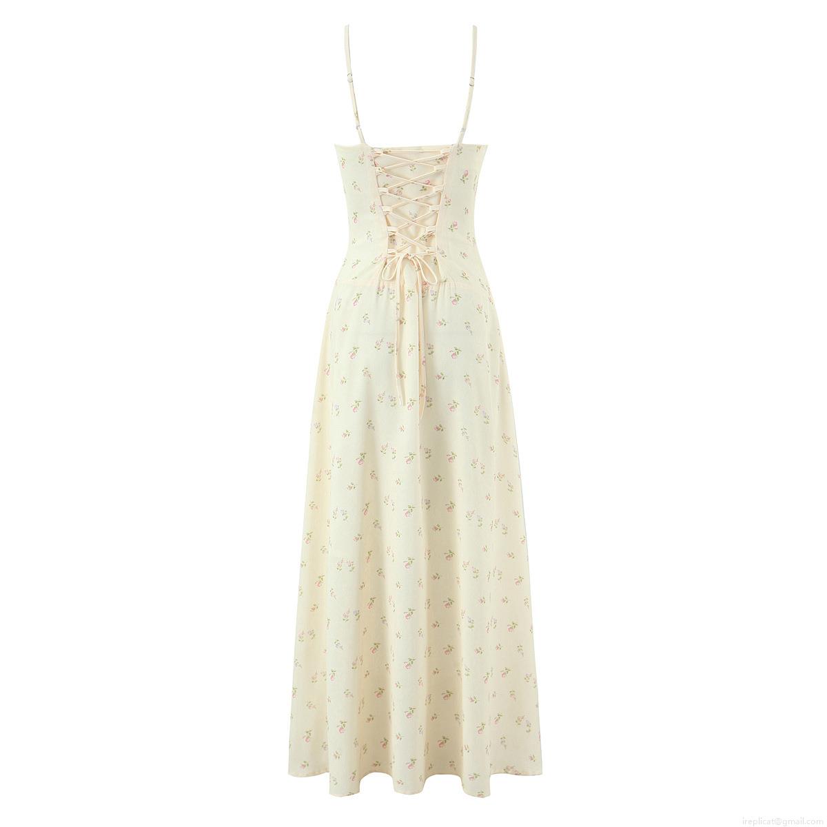 • French Vintage Floral Print Slip Dress Summer Women 100% Polyester Lace-up Back Slim Fit Midi Dress For Daily Holiday Ladies Fashionable Streetwear