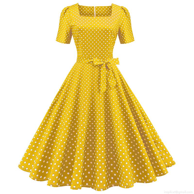 • French Vintage Polka Dot Dress Square Neck Short Sleeve A-Line Midi Dress High Waist With Bow Women's Elegant Retro Party Casual Dresses