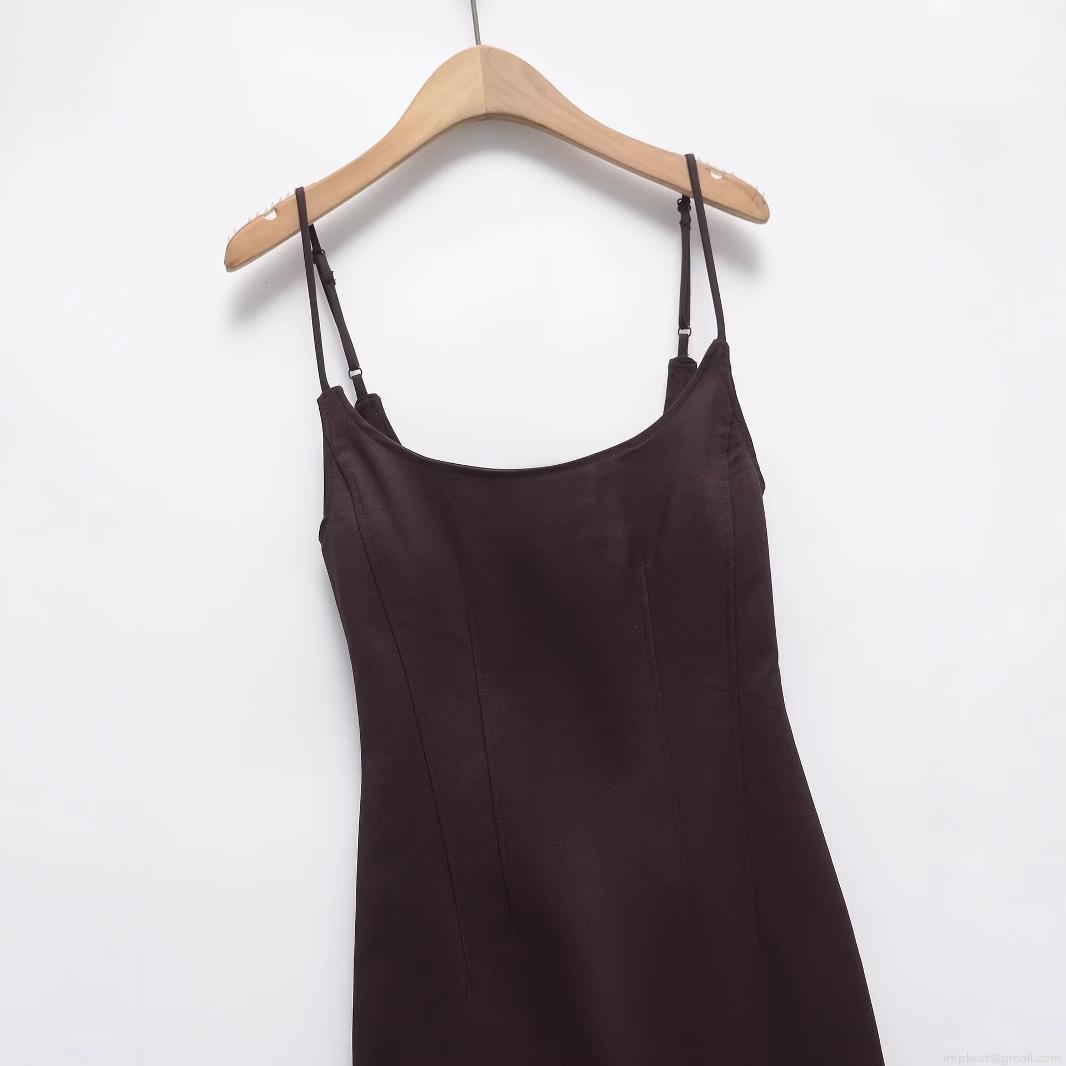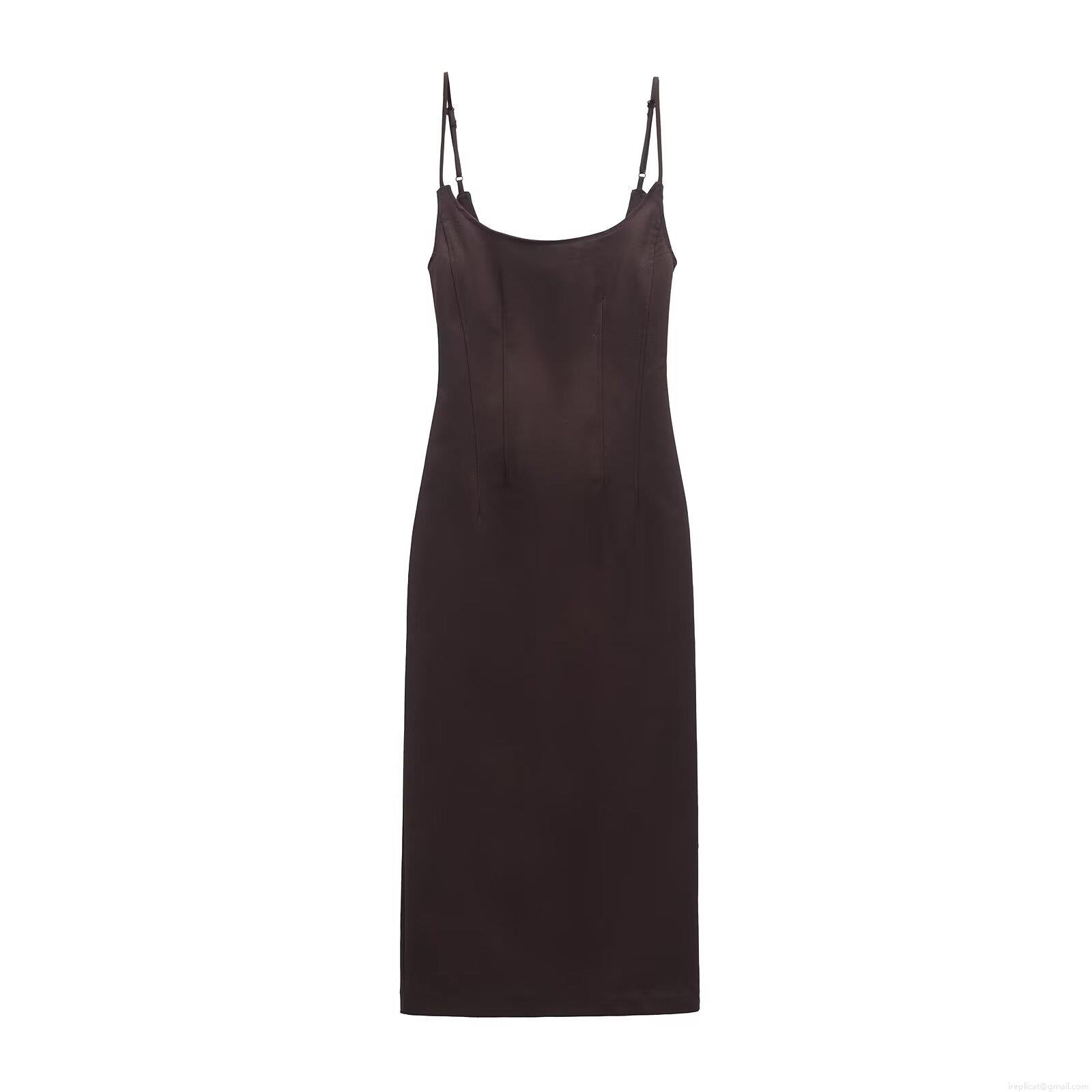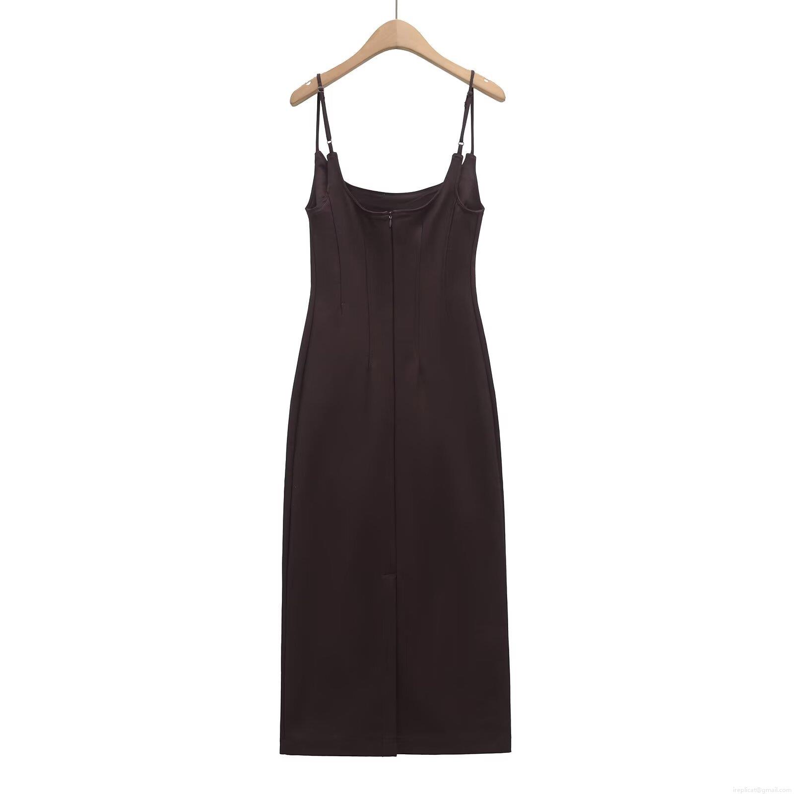• French Vintage Satin Cami Midi Dress For Women Elegant Bodycon Backless Split Party Evening Dress With Adjustable Straps Dark Brown