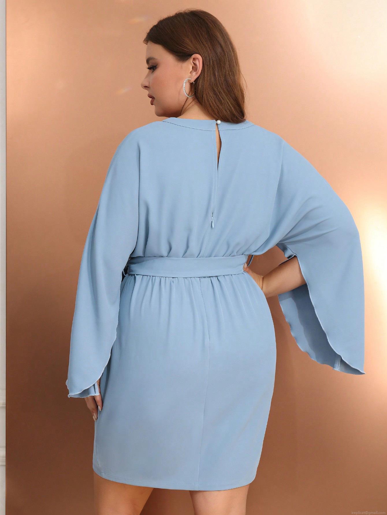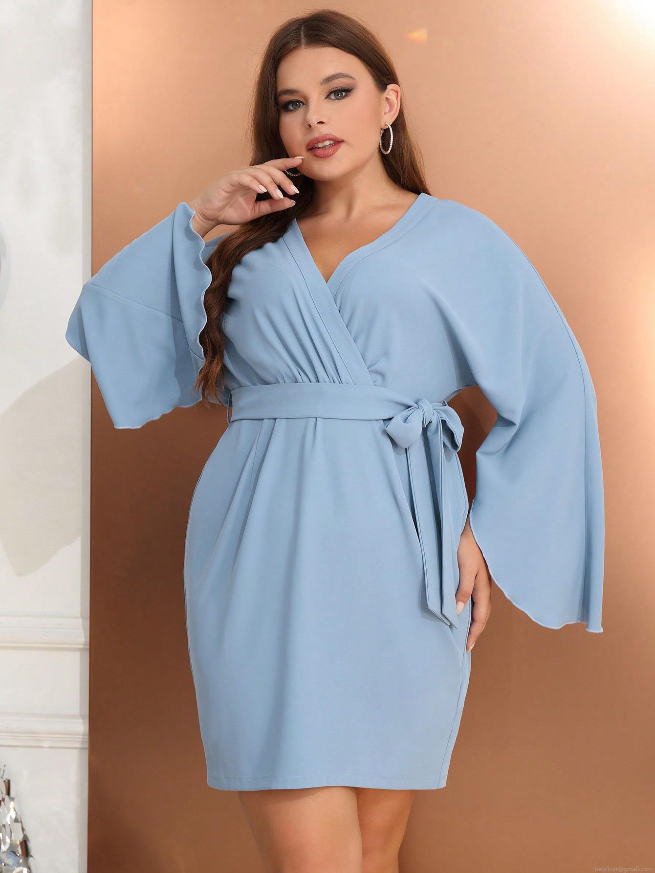 • Plus Size Women Elegant V Neck Dress With Belt Lantern Split Long Sleeve Solid Color Polyester Wrap Midi Dress For Casual Party Office Lady