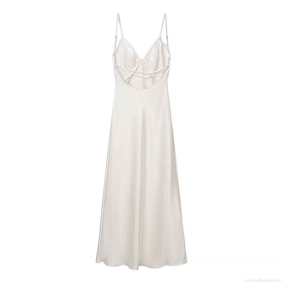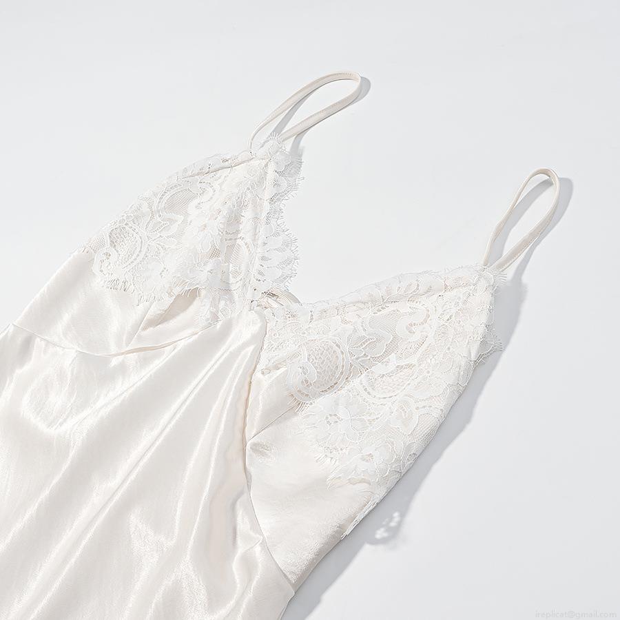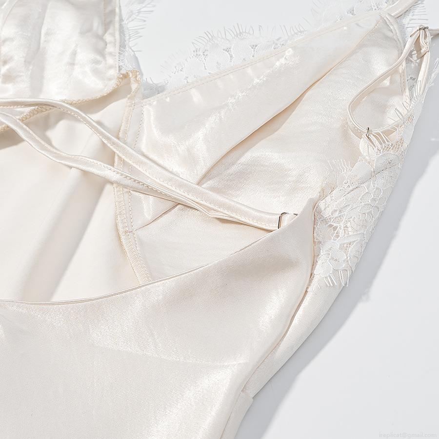• Sexy Backless Lace Stitching Satin Polyester Slip Dress Women V-Neck Sleeveless Mid-Length Cream White Nightgown Elegant Evening Party Wear