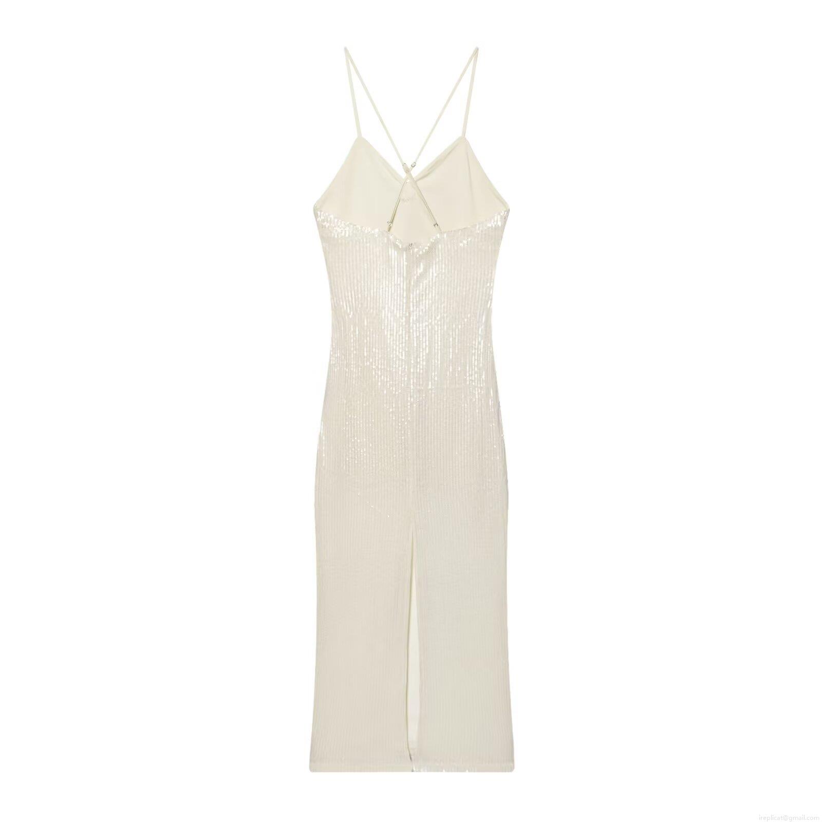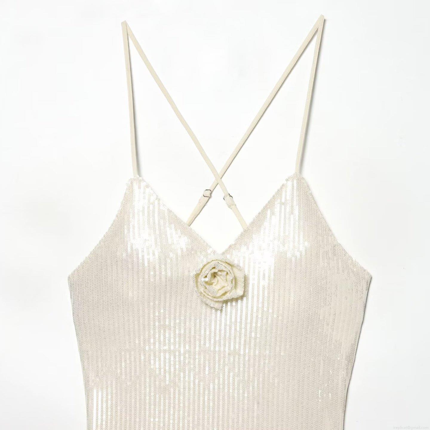 • Sexy Backless Sequin Cami Maxi Dress With 3D Rose Flower Detail V Neck Slim Fit Evening Party Gown For Women Elegant Spaghetti Strap Slit Dresses