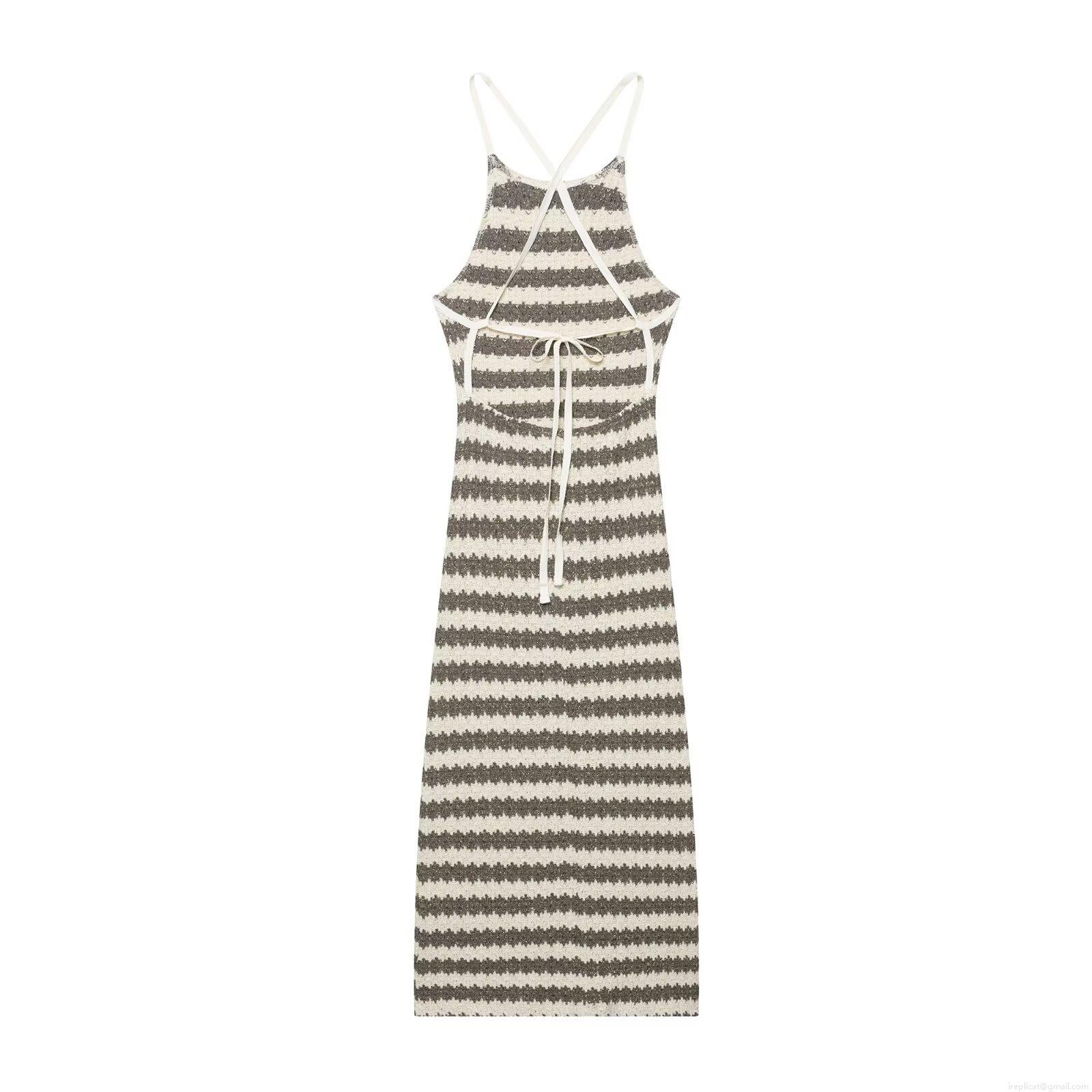 Sexy Backless Striped Knitted Midi Dress Women Halter V Neck Cross Strappy Sleeveless Club Party Wear Street Style With Gold Lurex Polyester