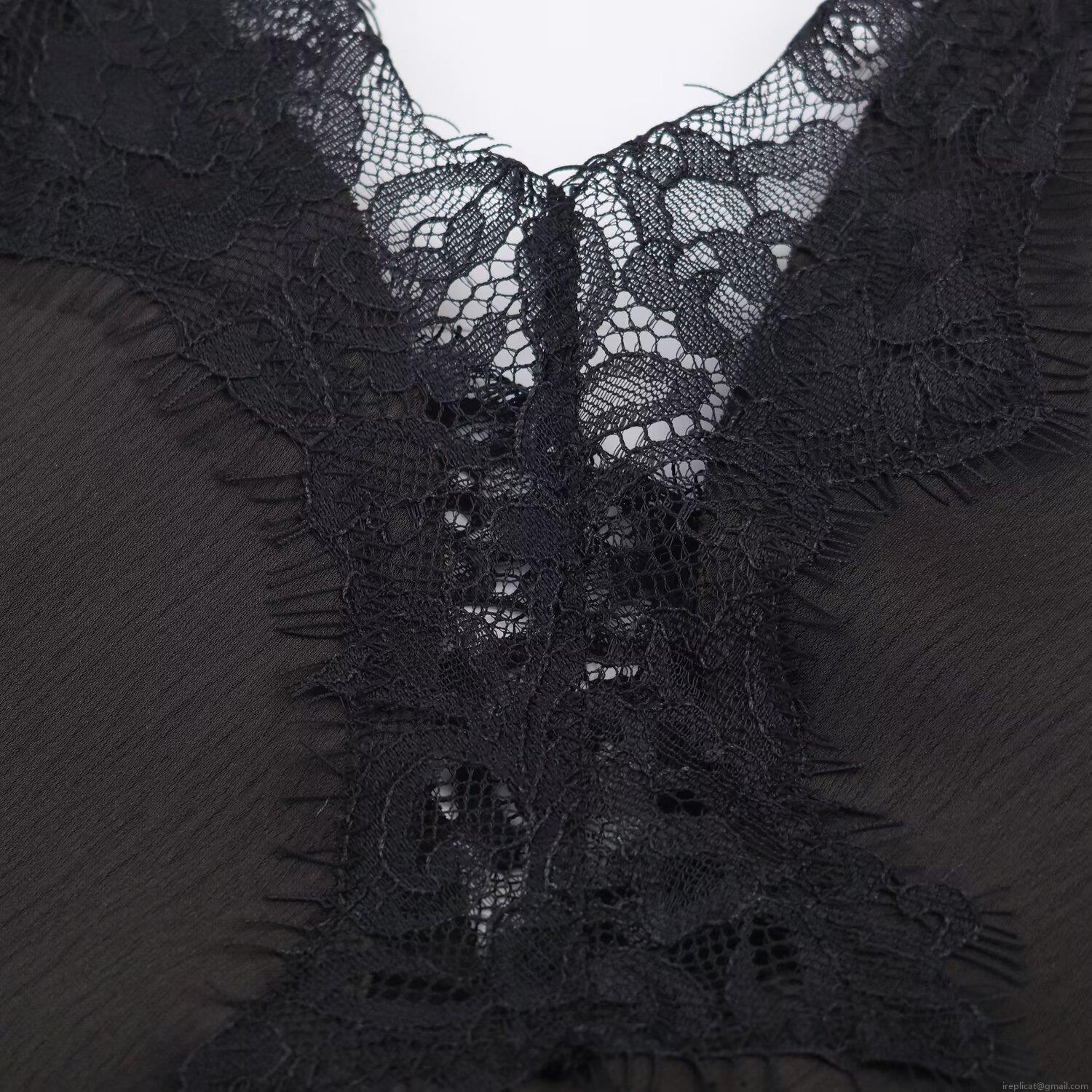 • Sexy Black Lace Trimmed Satin Midi Dress For Women V Neck Sleeveless Backless Sling A-Line Party Evening Clubwear Solid Elegant Slip Dress