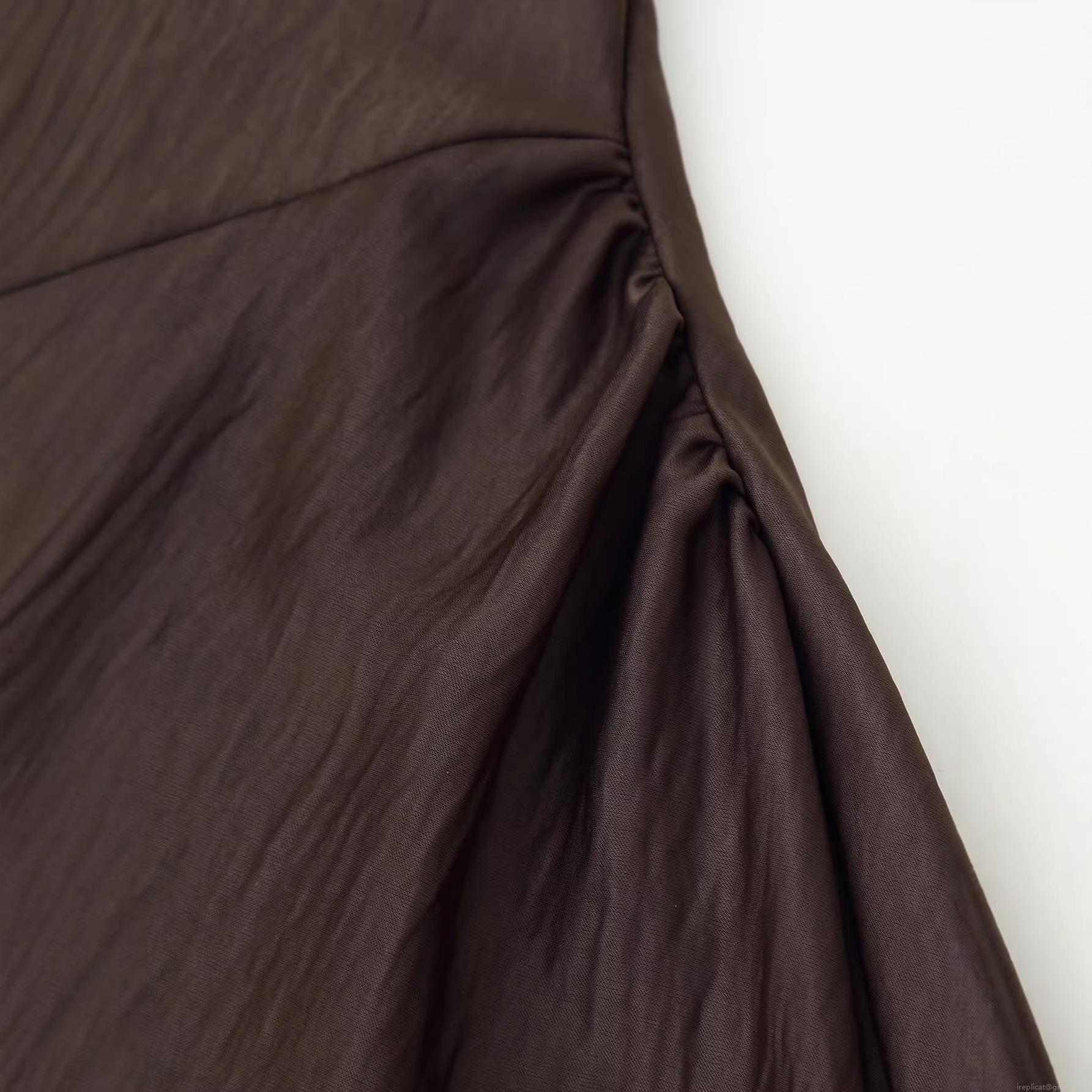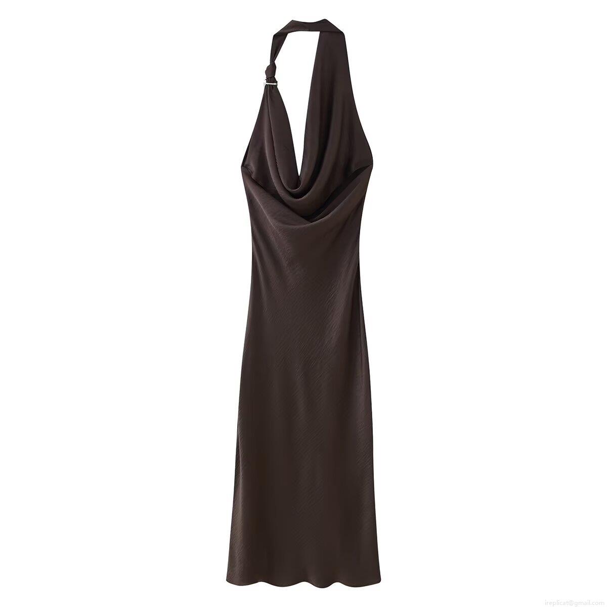 • Sexy Cowl Neck Halter Satin Midi Dress Asymmetric Backless Ruched Bodycon Party Evening Coffee Brown Slip Dress with Metal Ring Decoration
