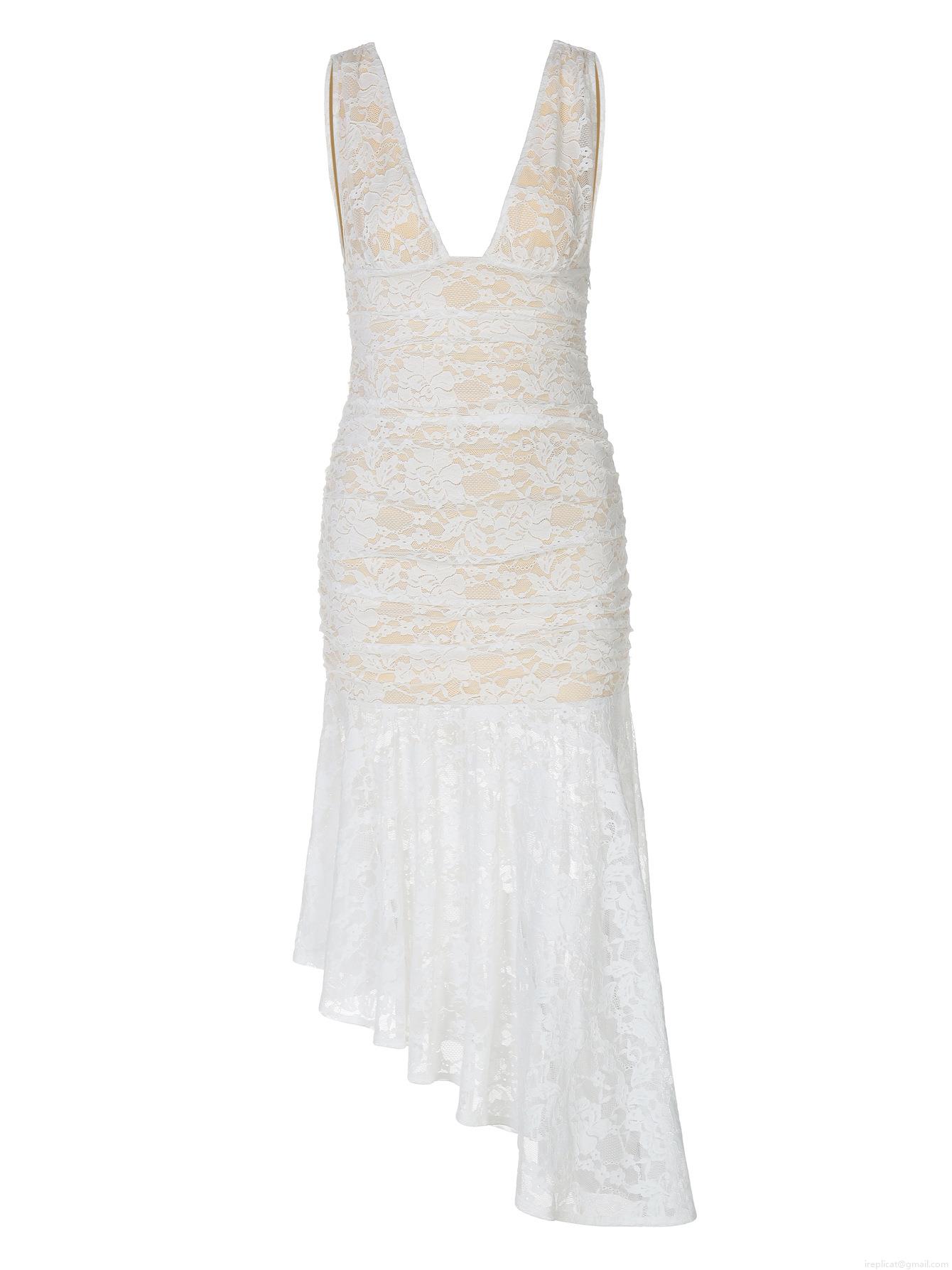 • Sexy Deep V Neck Backless Lace Midi Dress Women Sleeveless Ruffle Irregular Hem Slim Fit Evening Dress For Summer Party Banquet Elegant Lady Clothing
