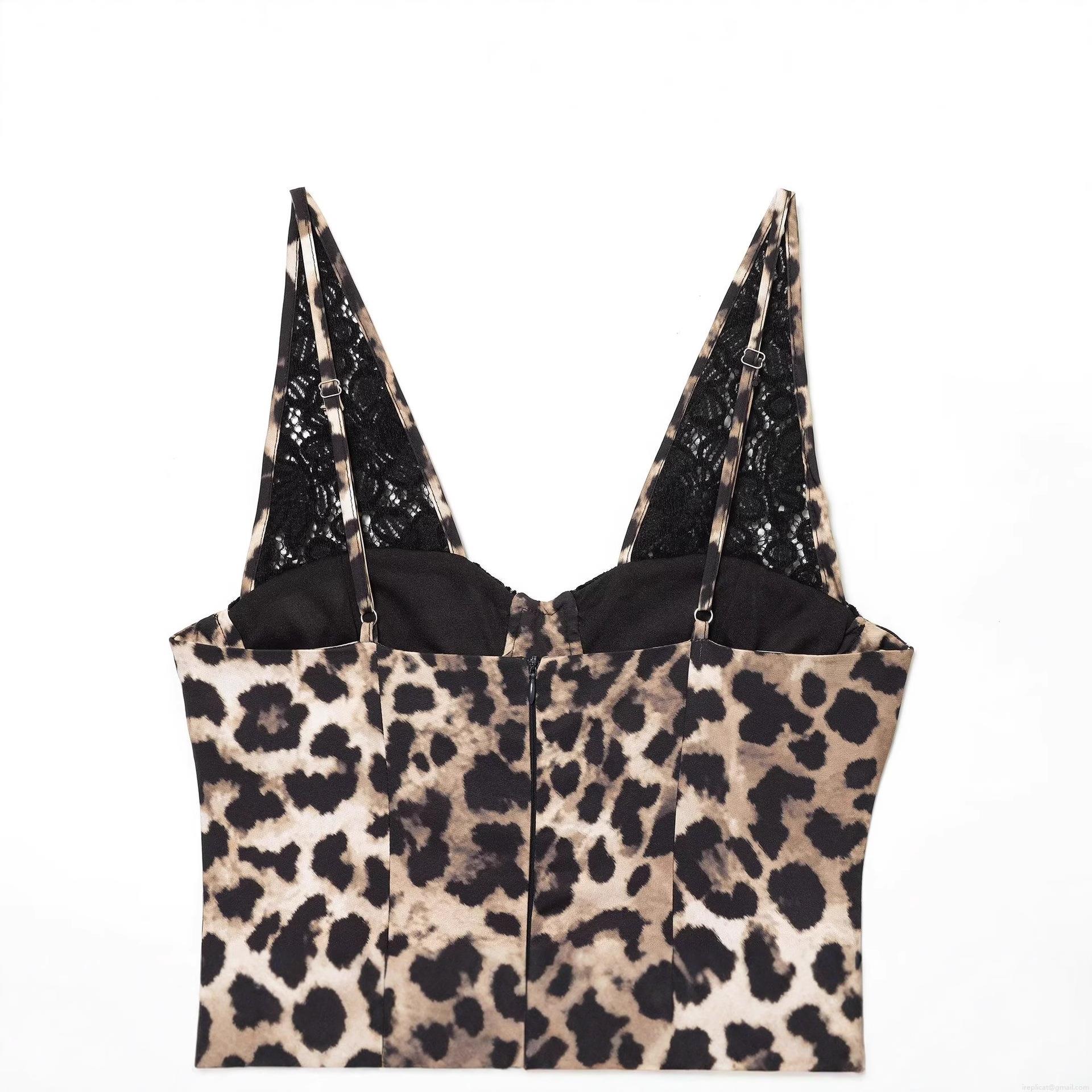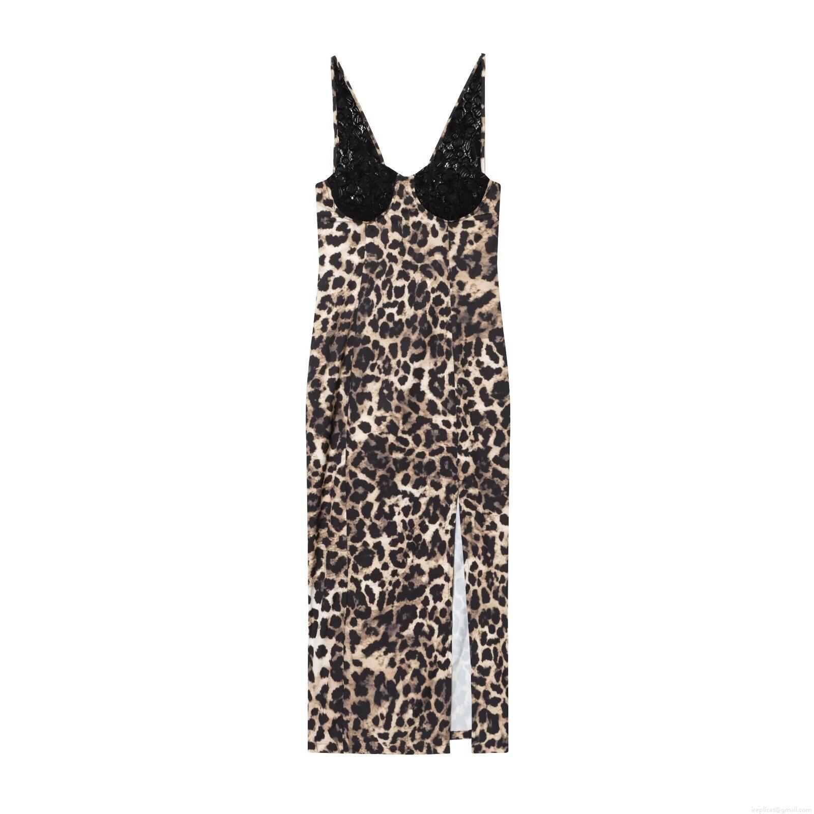 Sexy Leopard Print Midi Dress For Women Polyester Spandex With Black Lace Spaghetti Straps V Neck High Slit Back Zipper Slim Fit Elegant Bodycon Party Club Night Date Vacation