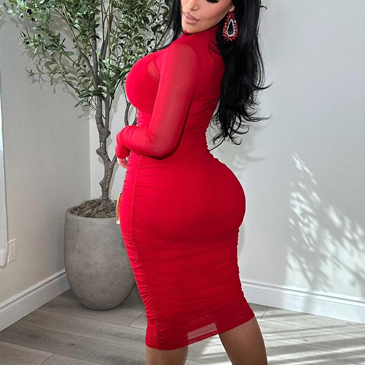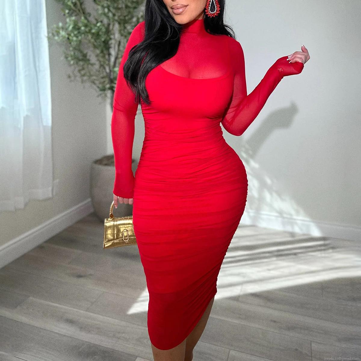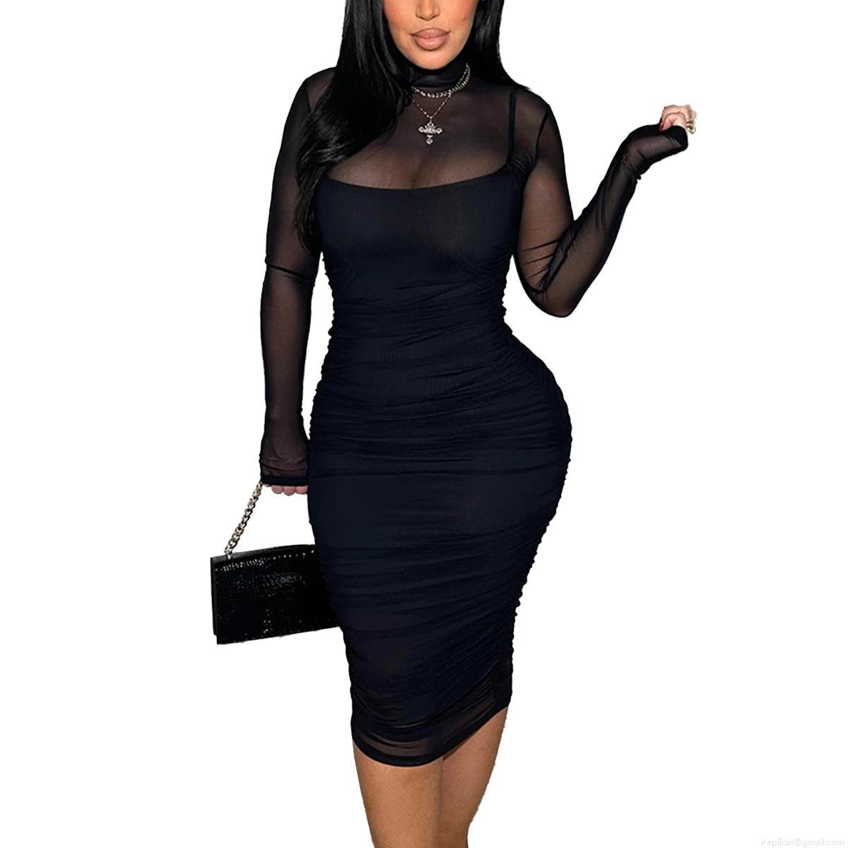 Sexy Mesh See-Through Two-Piece Midi Dress Set Ruched Long Sleeve High Neck Bodycon Dress With Camisole Lining For Women Party Clubwear Elegant Outfit